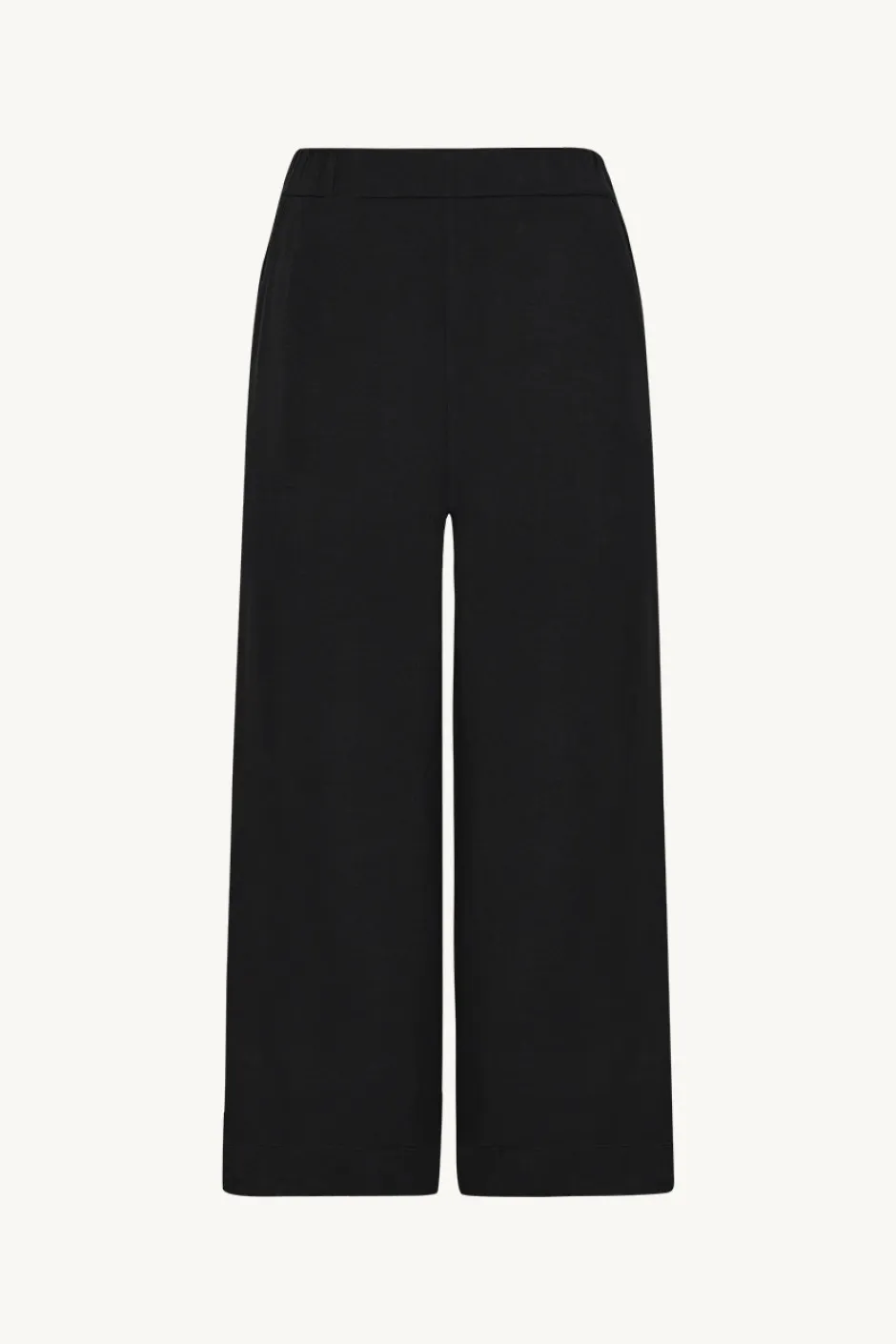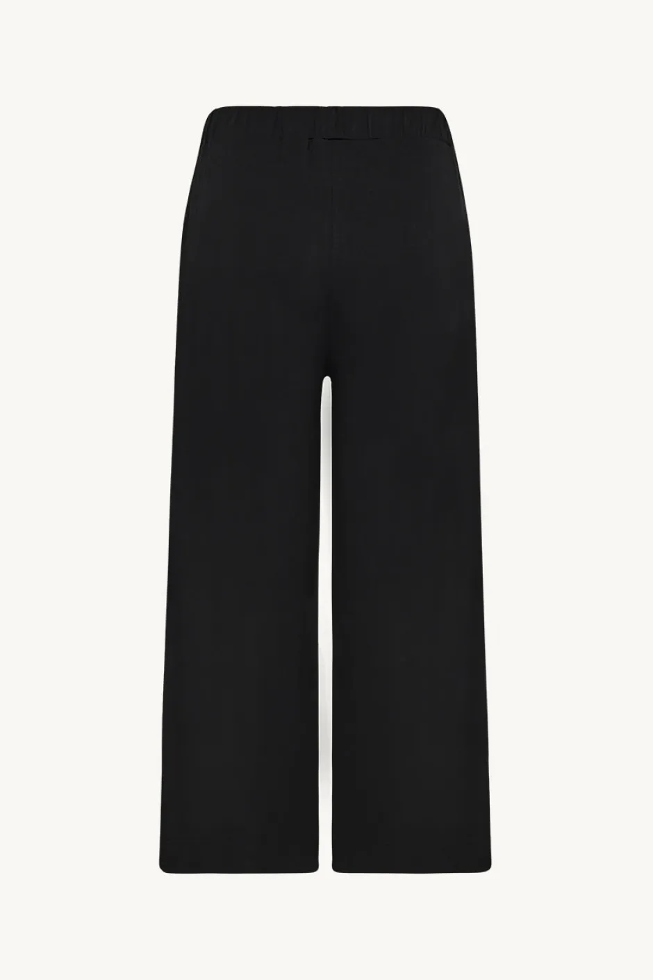 Klassiset housut, joissa leveät, mutta hieman lyhennetyt lahkeet ja kuminauha vyötärö.