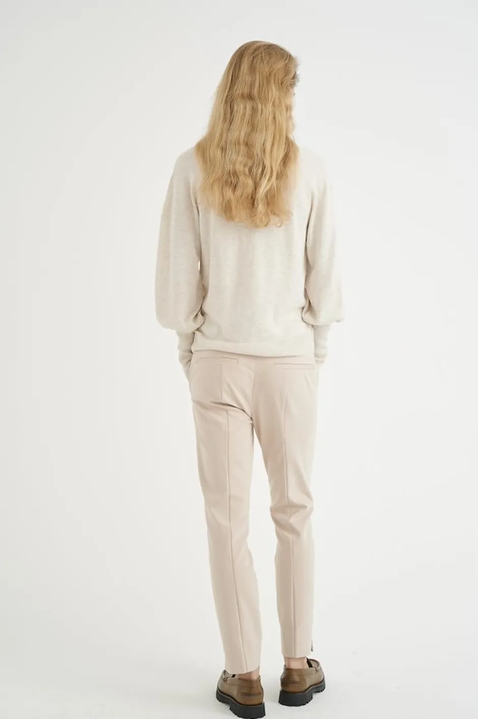 Hyvin istuvat nilkkapituiset puuvillahousut, joissa pikkuhalkiot lahkeensuussa. Normaali vyötärö.