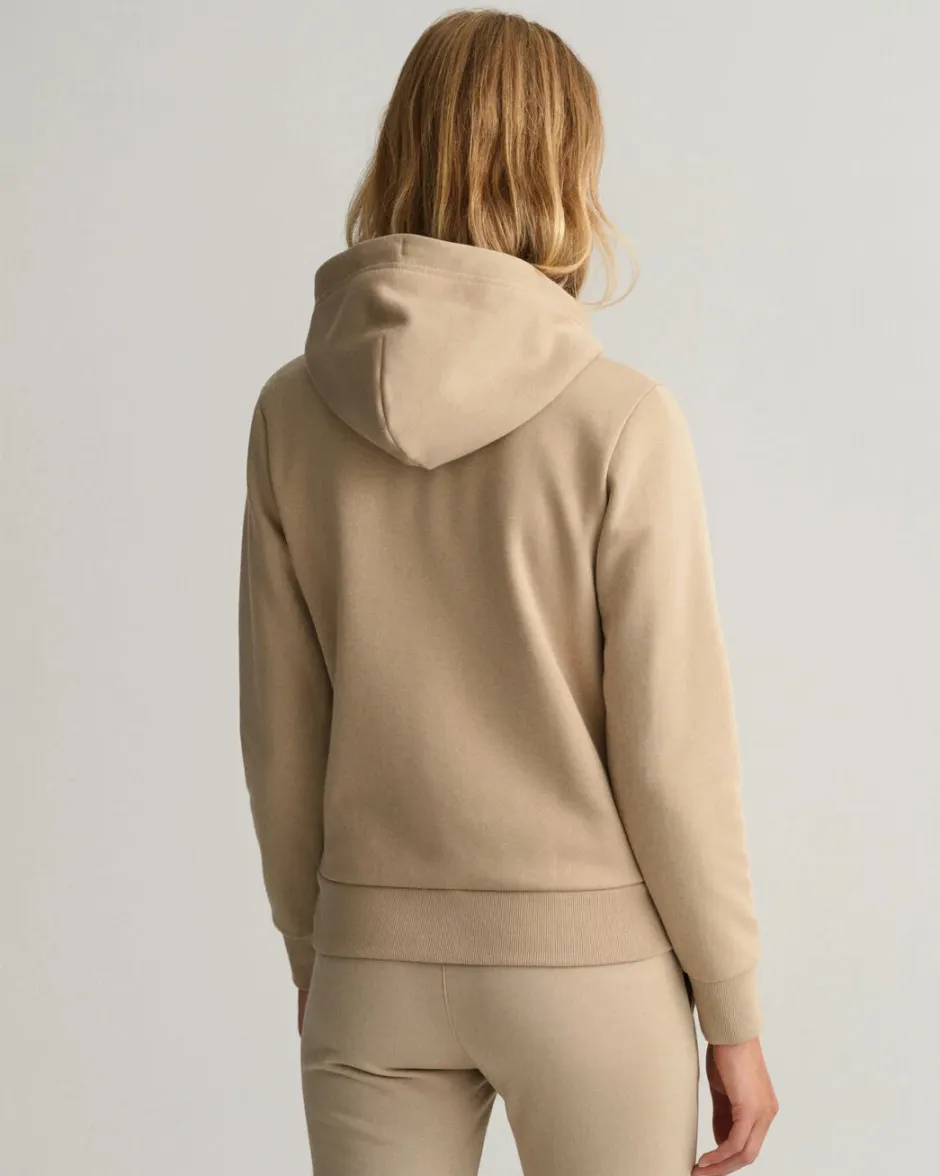 Naisten vetoketjuhuppari, jonka hupussa on kiristysnyöri ja rinnassa kiiltävällä langalla kirjailtu Gantin Archive Shield -logo.