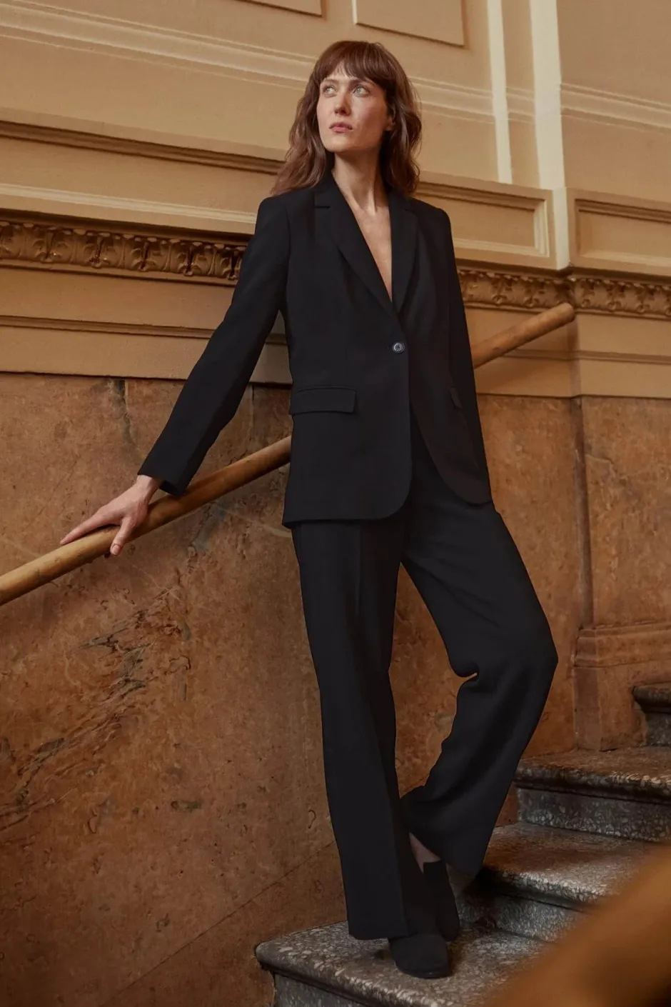 Kenzie-jakku on klassisen ajaton ja tyylikäs. Bleiserin materiaali on innovatiivista triasetaatin ja kierrätyspolyesterin sekoitetta; selluloosatriasetaatti valmistetaan puumassasta. Laadukas kangas laskeutuu kauniisti ja kestää hyvänä pitkään – materiaali ei rypisty eikä nyppyynny helposti, joten sen huolto on vaivatonta. Kenzie kuuluu Staples-mallistoomme, jonka tuotteet on suunniteltu pitkäikäisiksi luottovaatteiksi, joita on kätevä yhdistellä erilaisiin asuihin sesongista toiseen.