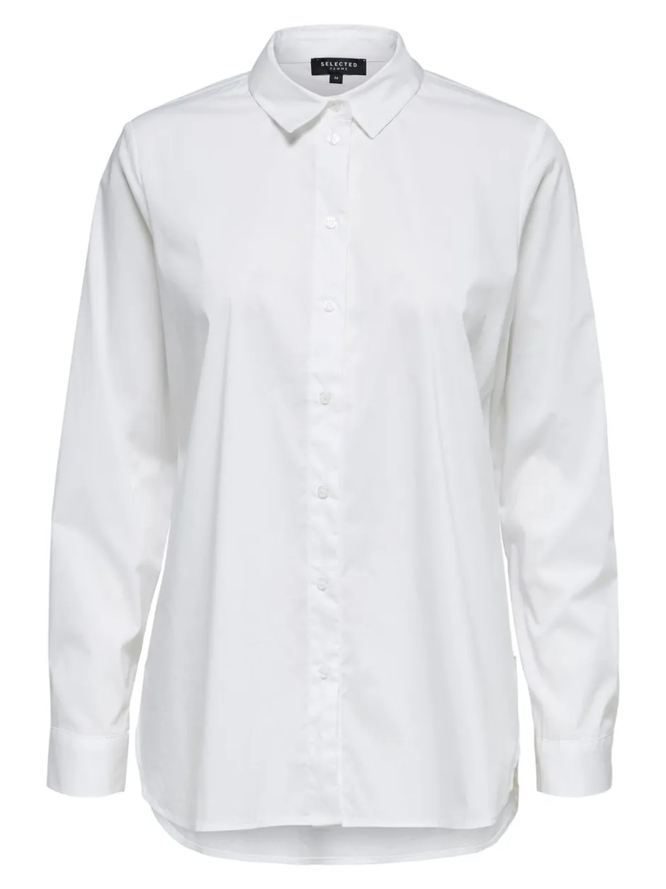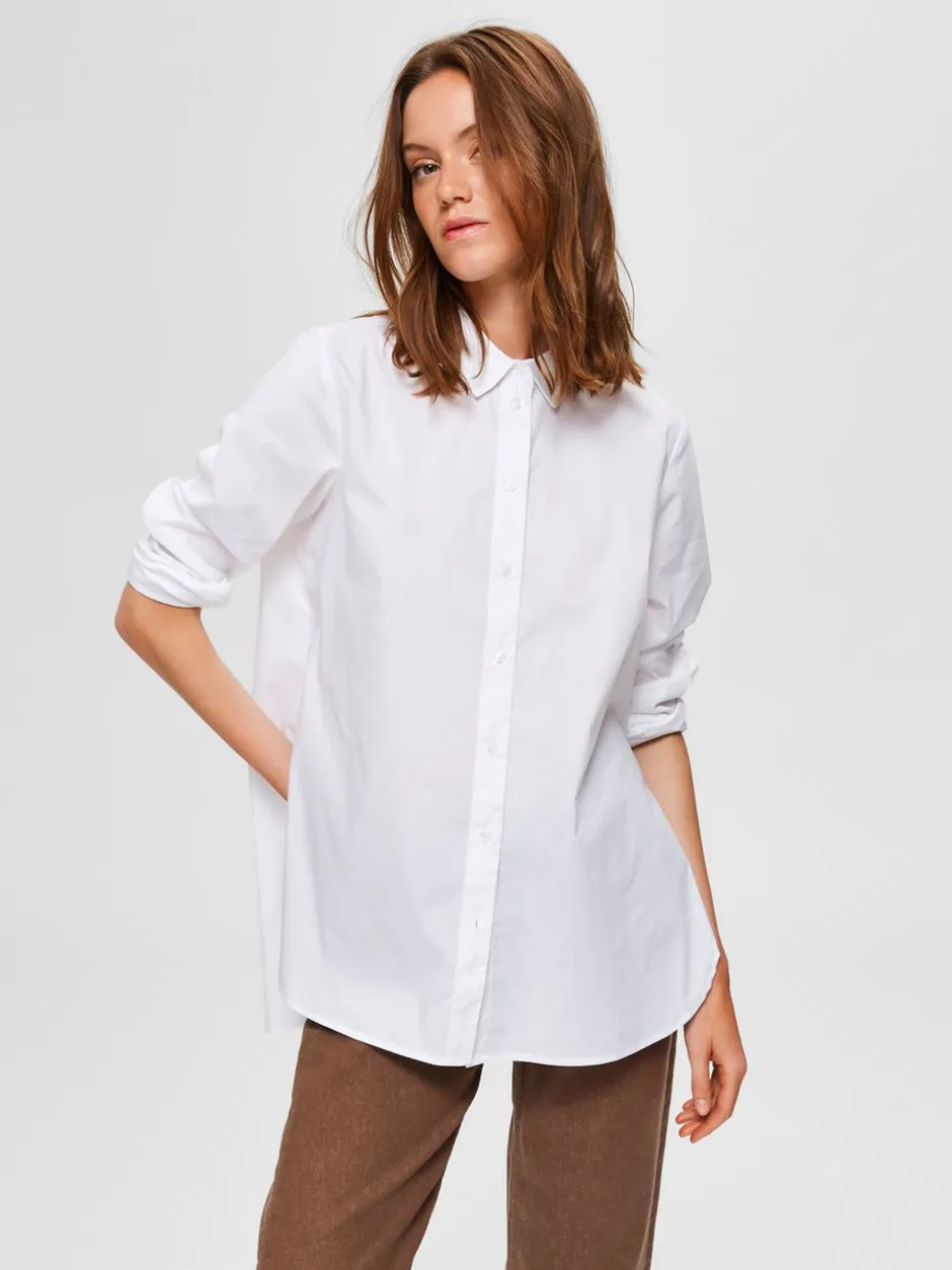 Selected Femmen naisten kauluspaita, jossa väljähkö istuvuus. Napitus ja kaulukset edessä. Sivusaumoissa piilovetoketjut ja trendikäs, muotoiltu helma.