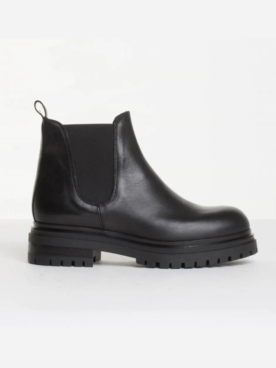 Bukelan tyylikkäät nilkkurit, jotka on valmistettu laadukkaasta nahasta. Midimittainen varsi, jonka sivuilla on joustavat kuminauhalevennykset. Paksu ja kuvioitu kumipohja.