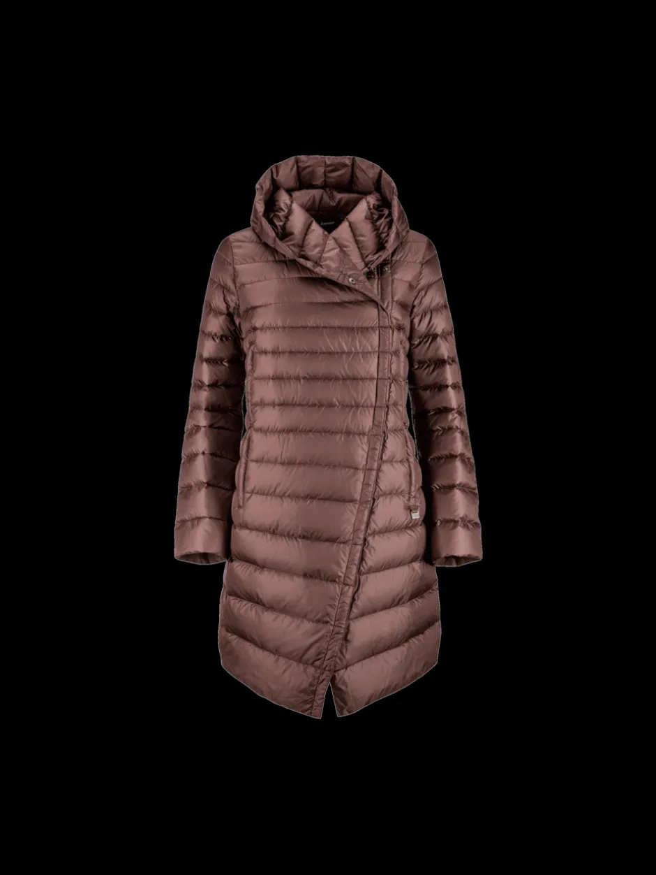 Lämmin kevytuntuvatakki. Vino nepparikiinnitys, hieman muotoonommeltu. Neljä vetoketjullista taskua ja sisätaskussa säilytyspussa.