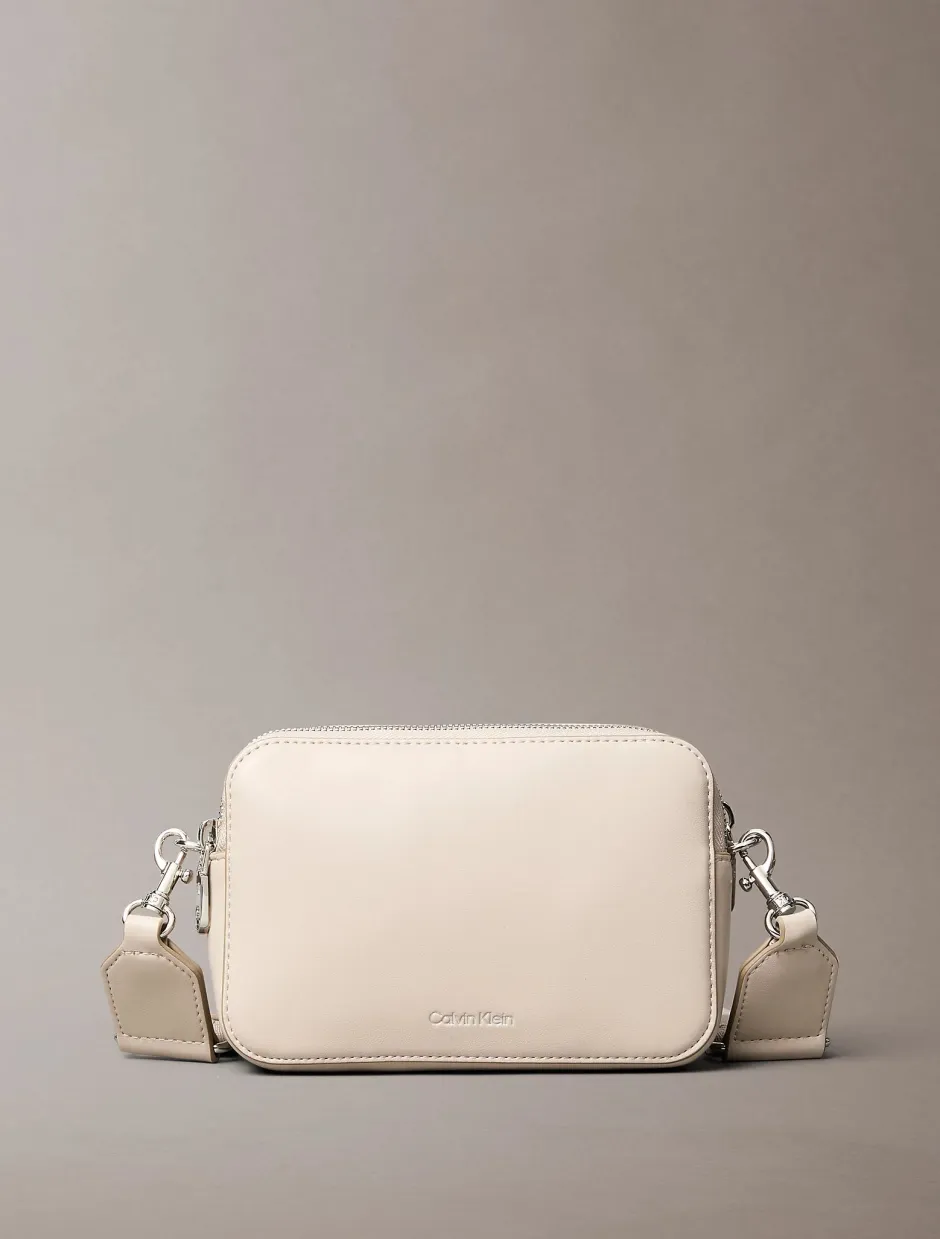 Tämä Calvin Klein Convertible 2‑Strap Crossbody Camera Bag yhdistää tyylikkään ilmeen ja älykkään suunnittelun. Ulkopinta on valmistettu pehmeästä keinonahasta, joka tuo rakenteellisuutta laukkuun. Laukussa on kaksi irrotettavaa ja säädettävää hihnaa (olkahihna ja crossover-hihna), joten sen voi kantaa joko olalla tai poikkisuunnassa. Laukussa on kaksi erillistä vetoketjutaskua, sisällä lokerot pikkutavaroille sekä klassinen Calvin Klein -webbing-logo crossover-hihnassa. Edessä on kalvopainettu logoteksti.