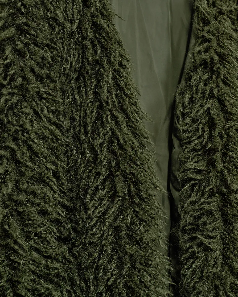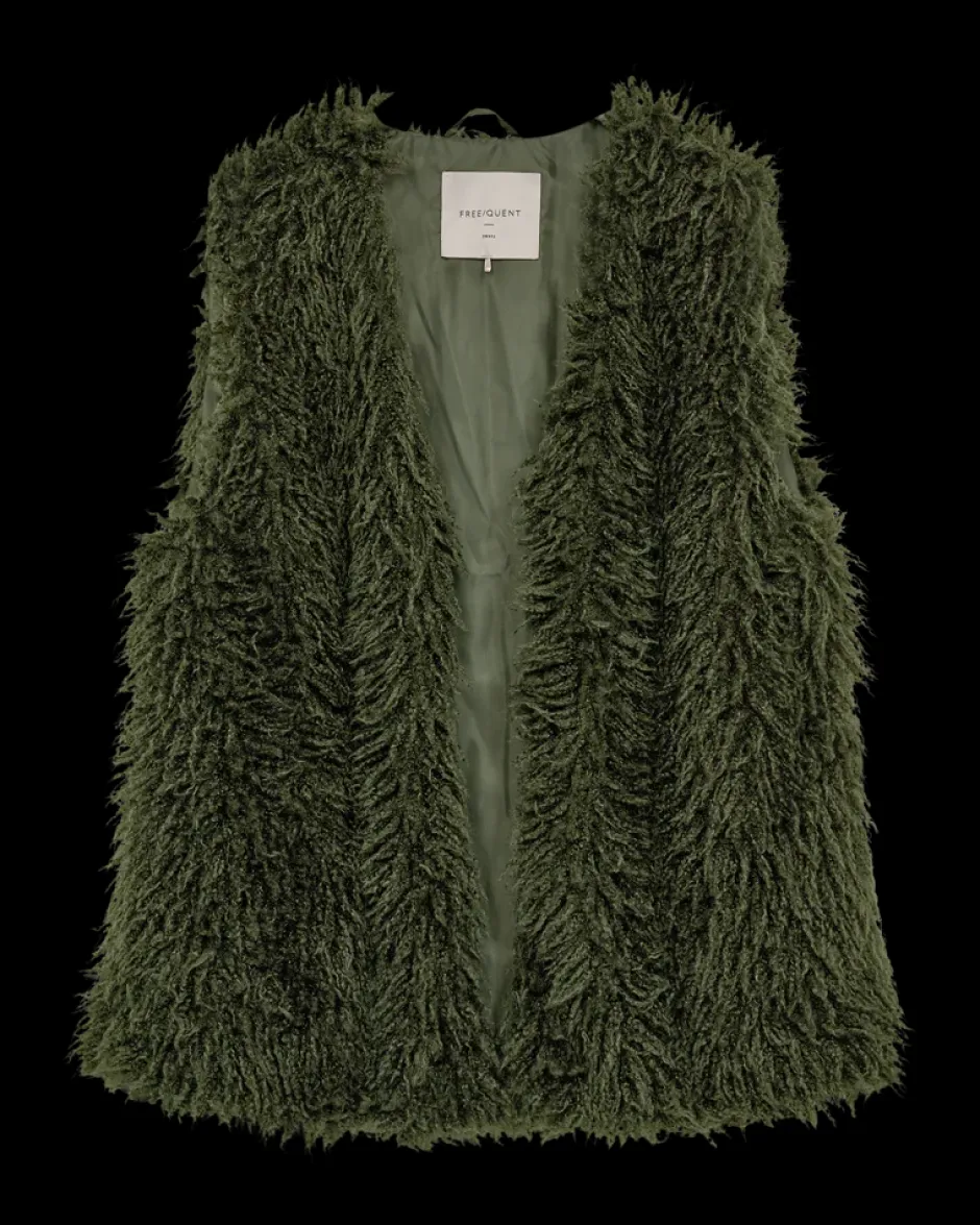 Freequent-liivi pehmeästä hapsukankaasta, jossa on vuori. Liivissä on yksinkertainen siluetti, syvä V-pääntie, piilotettu hakaskiinnitys edessä ja normaali istuvuus.