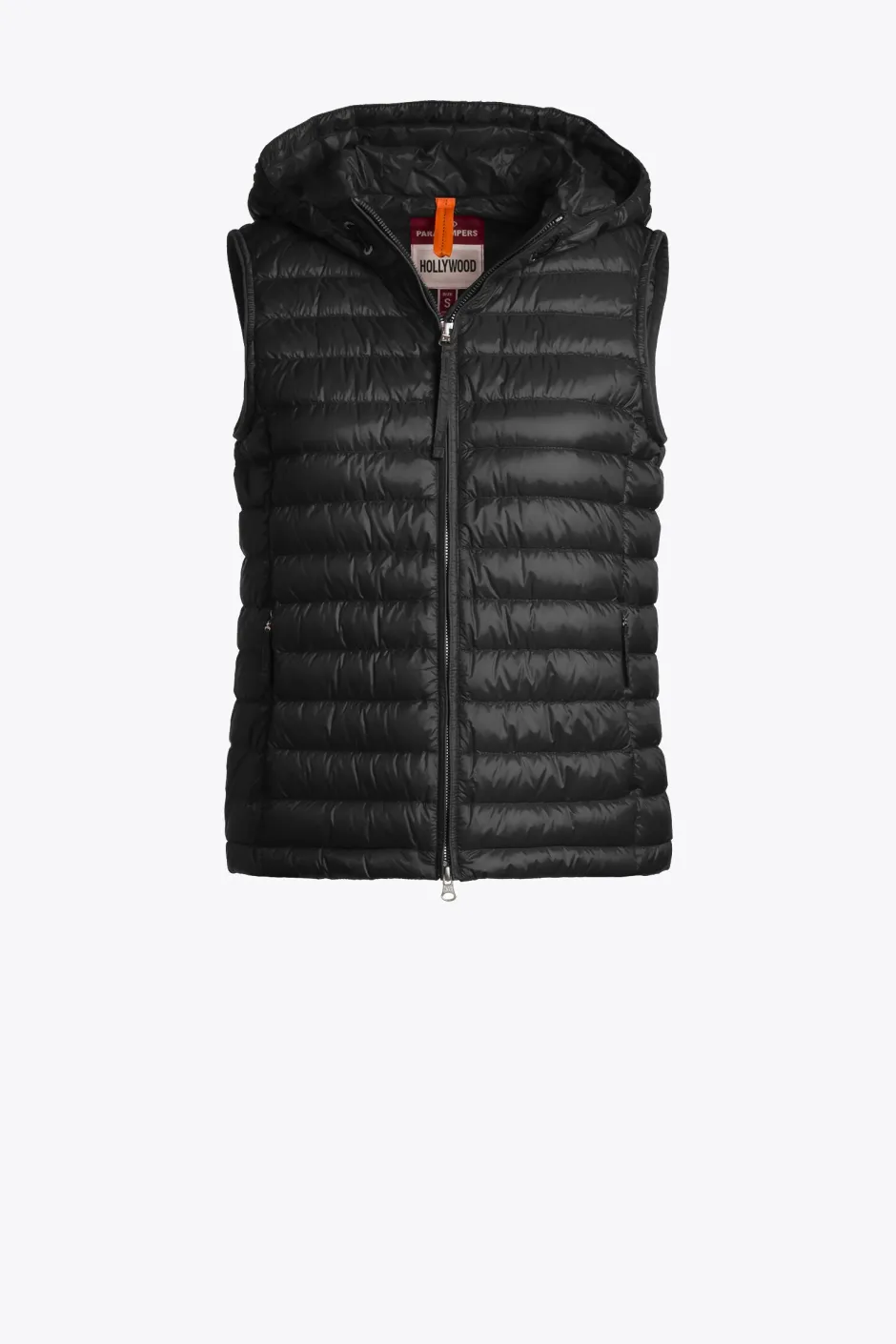 Naisten kevyt, beigenvärinen, hupullinen untuvaliivi. Naisellinen leikkaus, kangas kevyttä vettähylkivää nailonia, täyte ankanuntuvaa. Edessä vetoketjulliset taskut. Hupun reunassa kiristysnyöri, takana huppua muotoileva kiritysnyöri. Takana selässä vetoketjulla aukeava laskos, laskoksen pohja luonnonvalkoinen.