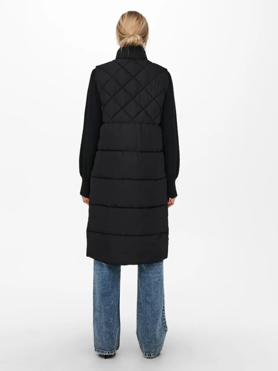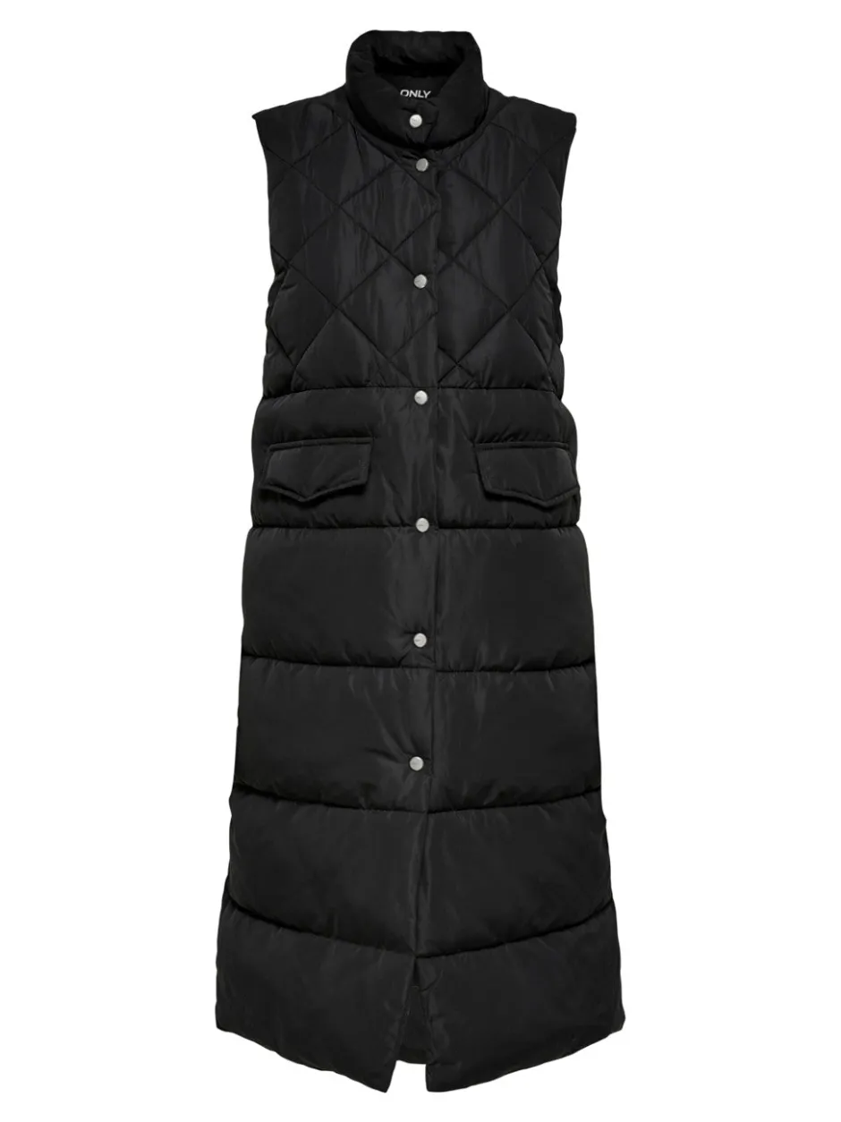 Only naisten pitkä toppaliivi. Liivissä nappikiinnitys edessä ylhäältä alas sekä korkea kaulus. Edessä molemmilla puolilla taskut. Liivin yläosassa tikkikangasta.