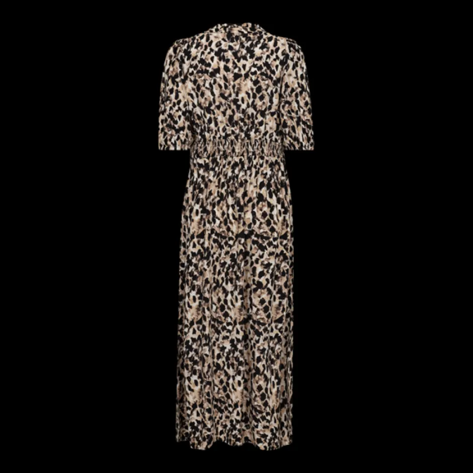 Freequent-maksimekko pehmeää materiaalia, jossa painatus. Mekossa on lyhyet ilmapallohihat, V-pääntie ja röyhelöinen kaulus, edessä nappikiinnitys ja smokki selässä korostamaan vyötäröä.