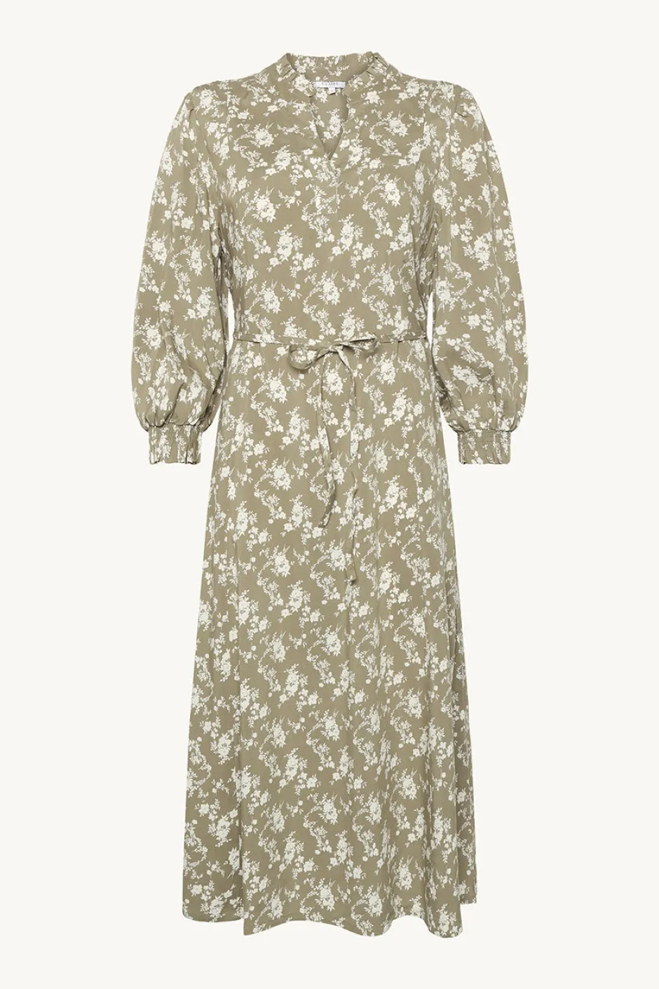 Mekko kudottua viskoosia, jossa on kukkaprintti ja röyhelökaulus. Tässä mekossa on V-pääntie ja laskokset olkapäillä sekä resori smocking hihoissa. Pituus on 125 cm.