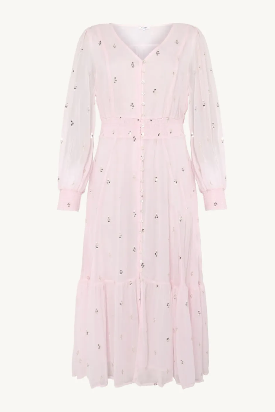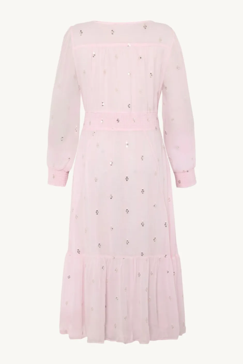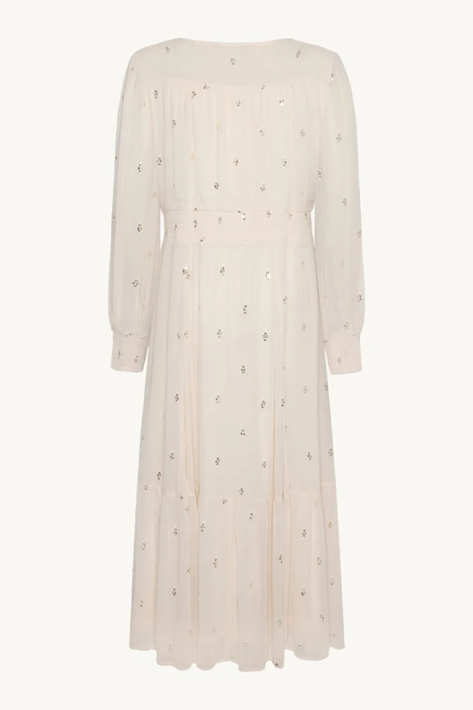 Vuorattu viskoosista valmistettu mekko, joka tuntuu ihanalta ja pehmeältä päällä. Mekossa on myös kauniita yskityiskohtia ja laskoksia olkapäillä. Siinä on nappikiinnitys edessä ja joustava kuminauharesori hihoissa sekä vyötäröllä.