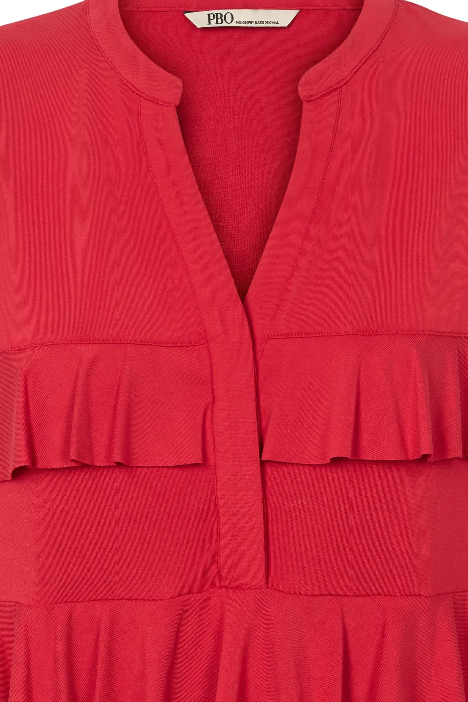 PBO:n upeassa röyhelömekossa on lyhyt helma ja pitkät hihat. Mekossa on v-pääntie, kapea istuvuus ja hihansuissa joustavat kuminauhat. Materiaali on joustavaa ja miellyttävän tuntuista modaali-sekoitetta.