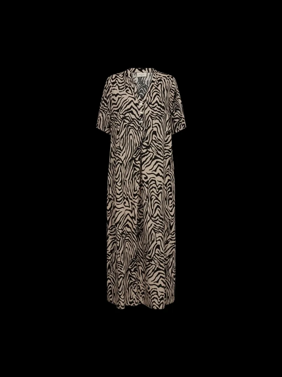Tämä kevyt ja ilmava mekko on valmistettu pehmeästä viskoosin ja pellavan sekoitteesta, joka tarjoaa miellyttävän tunteen iholla. Mekossa on ajaton eläinkuosinen printti, joka tuo asuun persoonallisuutta. V-pääntie ja nappikiinnitys edessä luovat klassisen ilmeen, kun taas lyhyet hihat ja joustava selkäosa takaavat mukavan istuvuuden. Edessä olevat laskokset korostavat leveää helmaa, joka laskeutuu kauniisti.