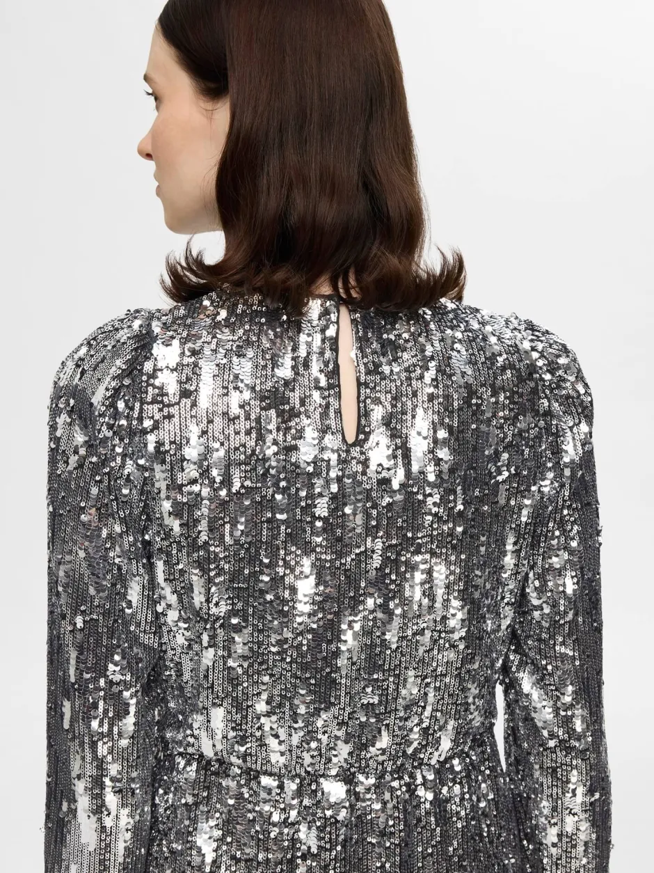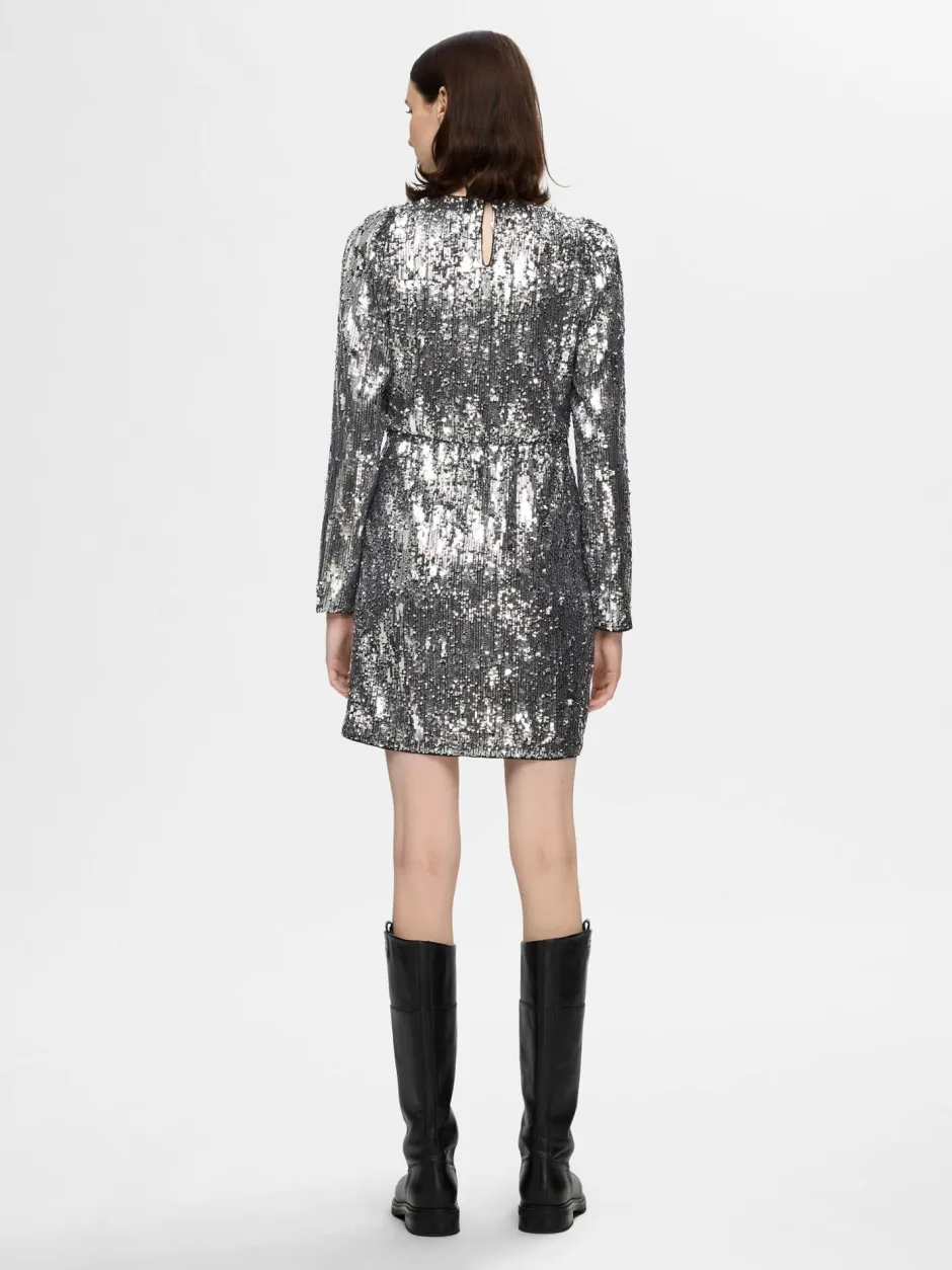 Pitkähihainen paljettimekko. Pyöreä pääntie.