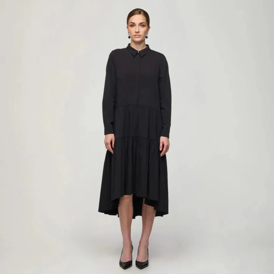 Pitkässä Triine-mekossa yhdistyvät kauluspaitamainen, istuva yläosa ja hulmuava, leveä helma. Mekossa on pitkät hihat ja kahdesta frillasta koostuva runsas helma. Materiaali on kevyen ylellistä ja joustavaa puuvilla-polyamidi-sekoitetta, ja siinä on tyylikäs ja hento kiilto.