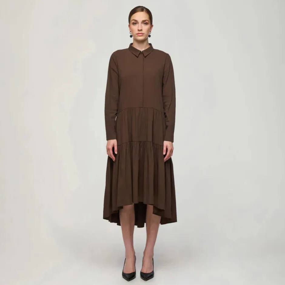 Pitkässä Triine-mekossa yhdistyvät kauluspaitamainen, istuva yläosa ja hulmuava, leveä helma. Mekossa on pitkät hihat ja kahdesta frillasta koostuva runsas helma. Materiaali on kevyen ylellistä ja joustavaa puuvilla-polyamidi-sekoitetta, ja siinä on tyylikäs ja hento kiilto.