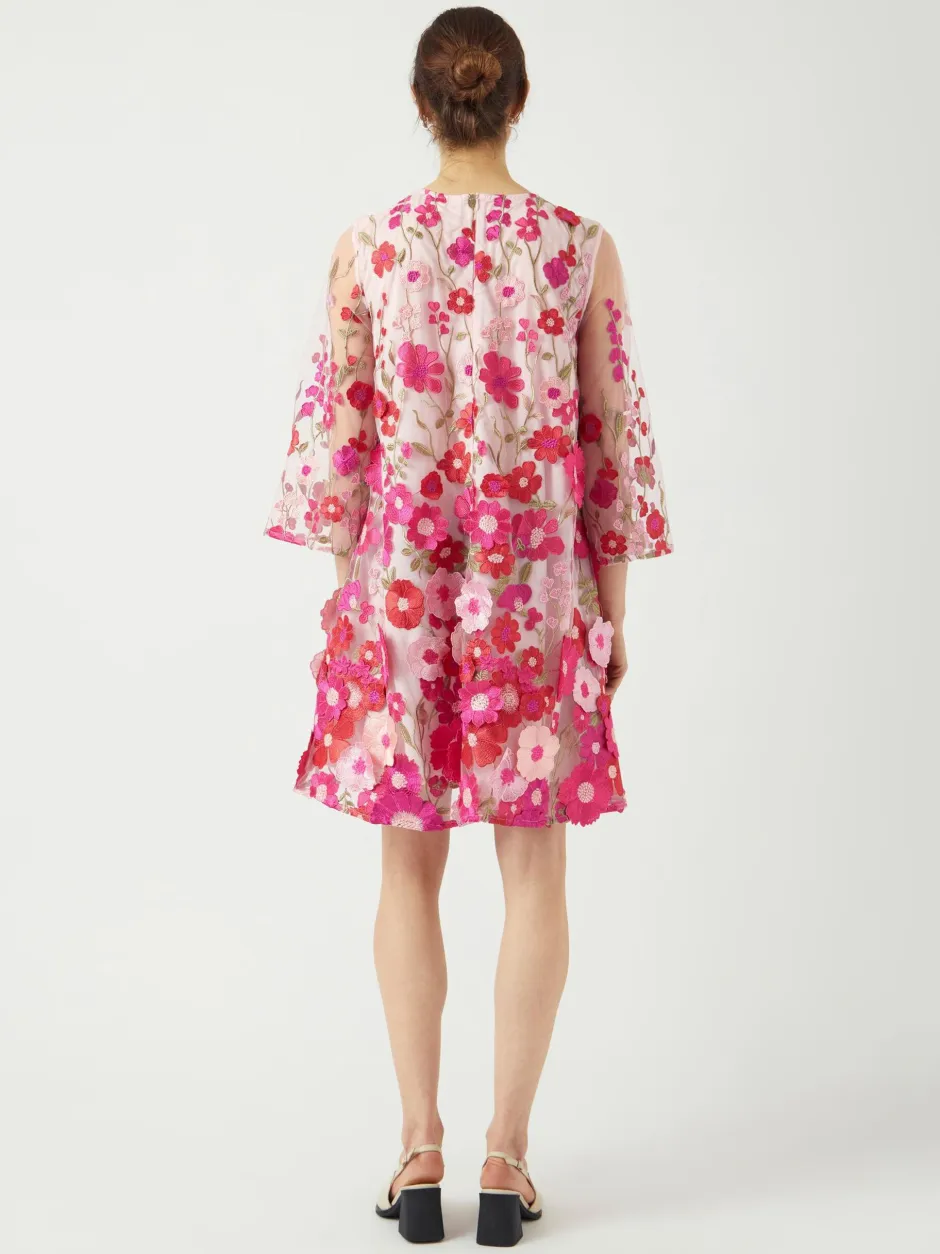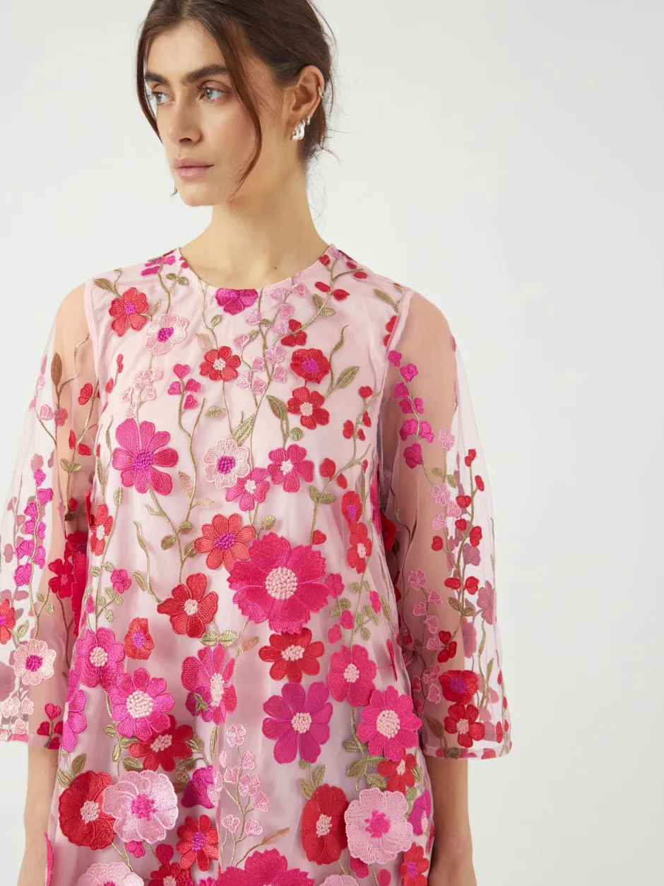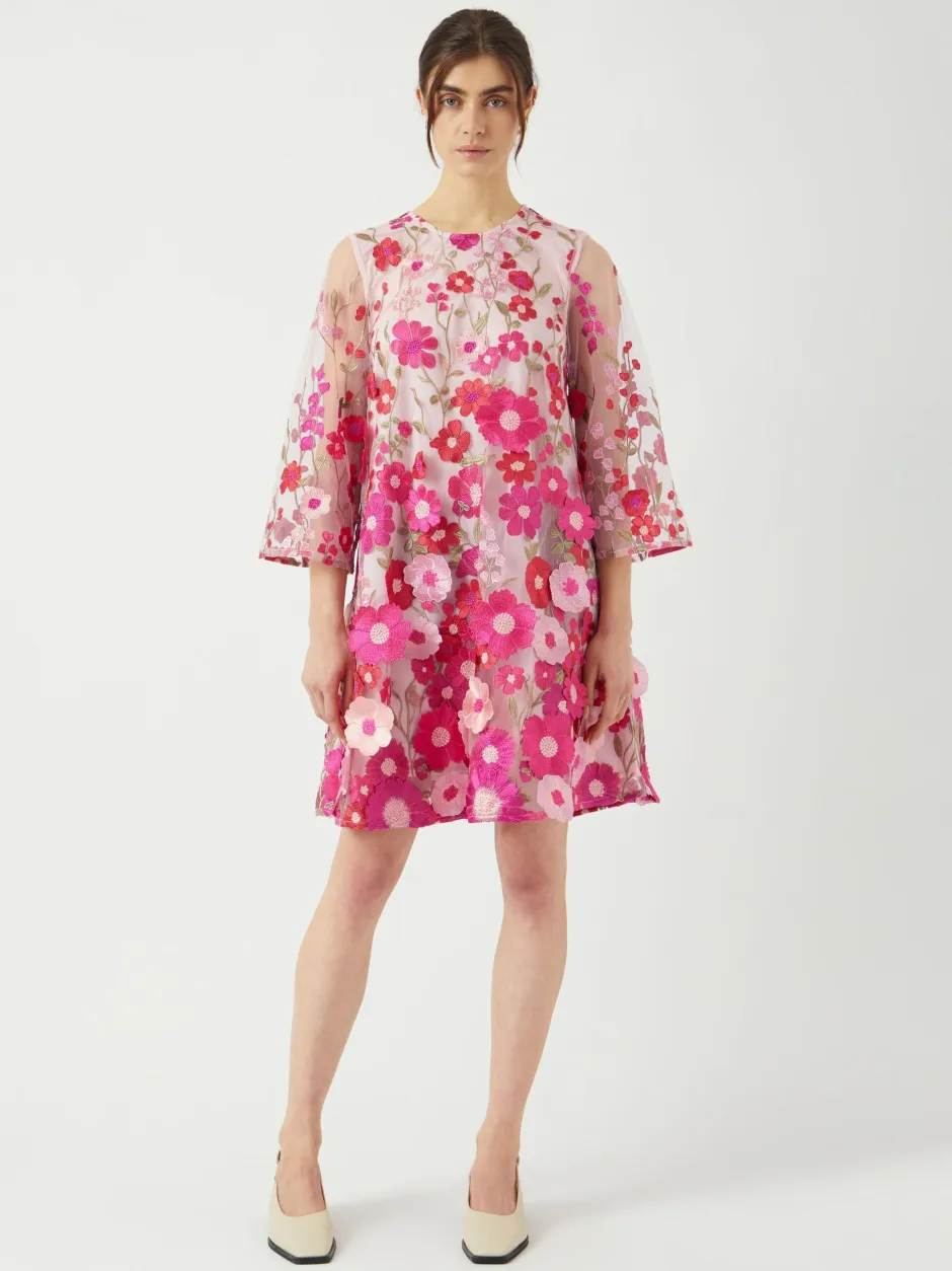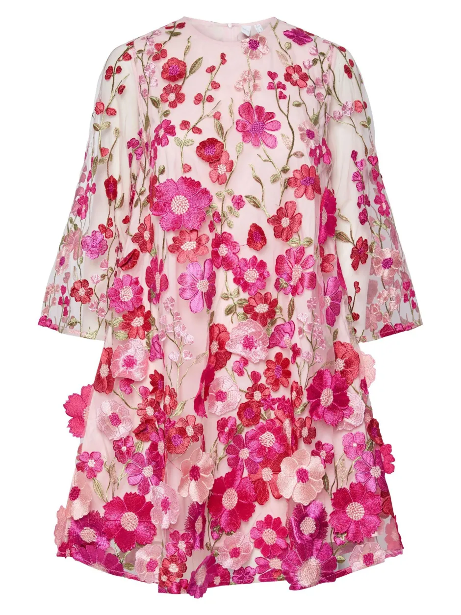 Juhlakauden ehdoton katseenvangitsija! Kauniissa mekossa korostuvat moniväriset kukat ja mukavuutta lisää A-linjainen leikkaus. Mekossa on piilovetoketju kiinnitys keskellä takana.