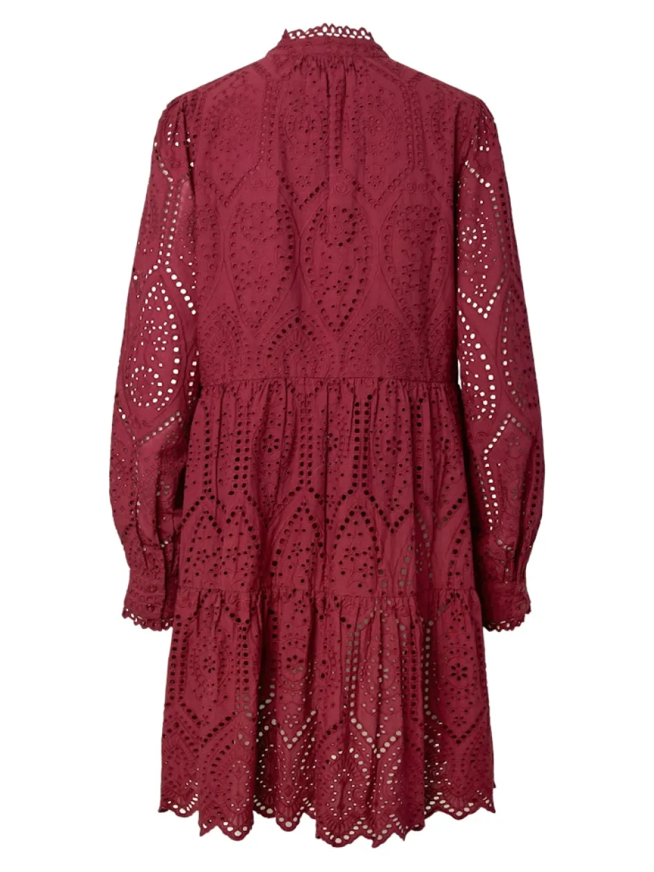 Röyhelöreunainen kiinalaiskaulus, v-pääntie, pallohihat. Hihansuissa röyhelöreunaiset kalvosimet. Kerrostettu helma, jossa brodeerattu siksakmuoto. Mekossa on vuori. Rento istuvuus.