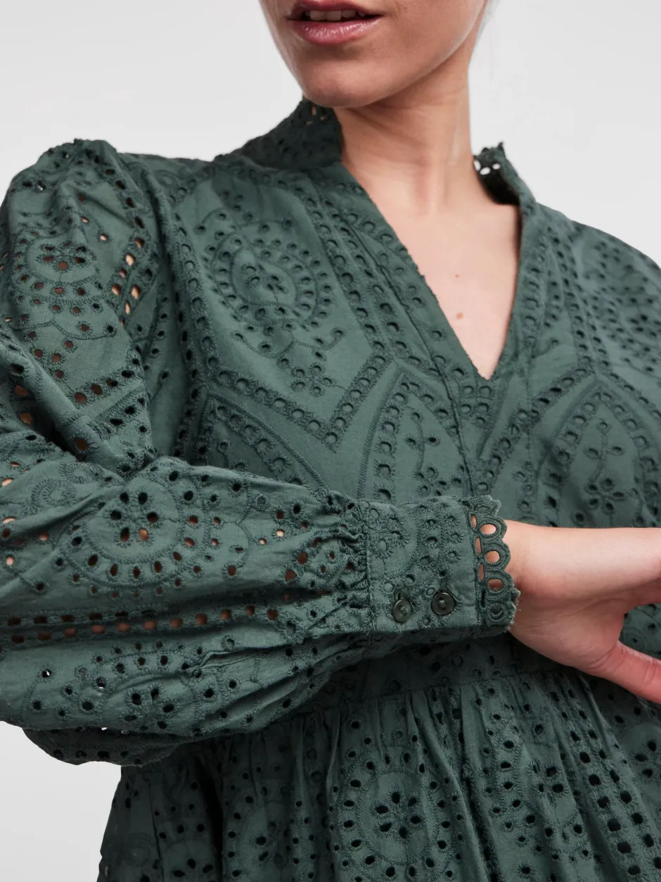 Röyhelöreunainen kiinalaiskaulus, v-pääntie, pallohihat. Hihansuissa röyhelöreunaiset kalvosimet. Kerrostettu helma, jossa brodeerattu siksakmuoto. Mekossa on vuori. Rento istuvuus.