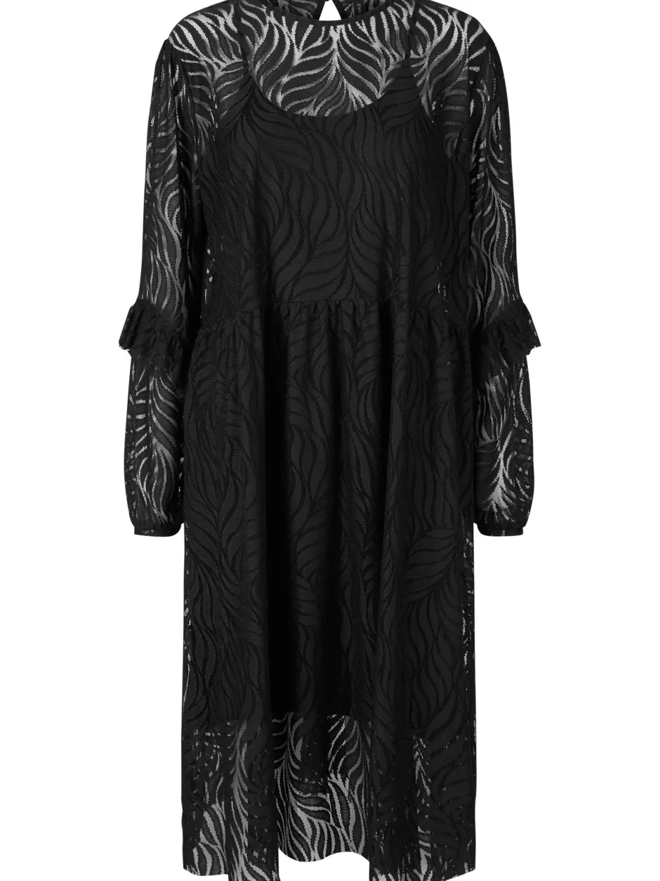 Naisten pitkähihainen pitsimekko. Mekko on läpikuultavaa pitsistä kangasta ja siinä on alla vuori. Hihat ovat röyhelöiset. Pituudeltaan mekko on midi.