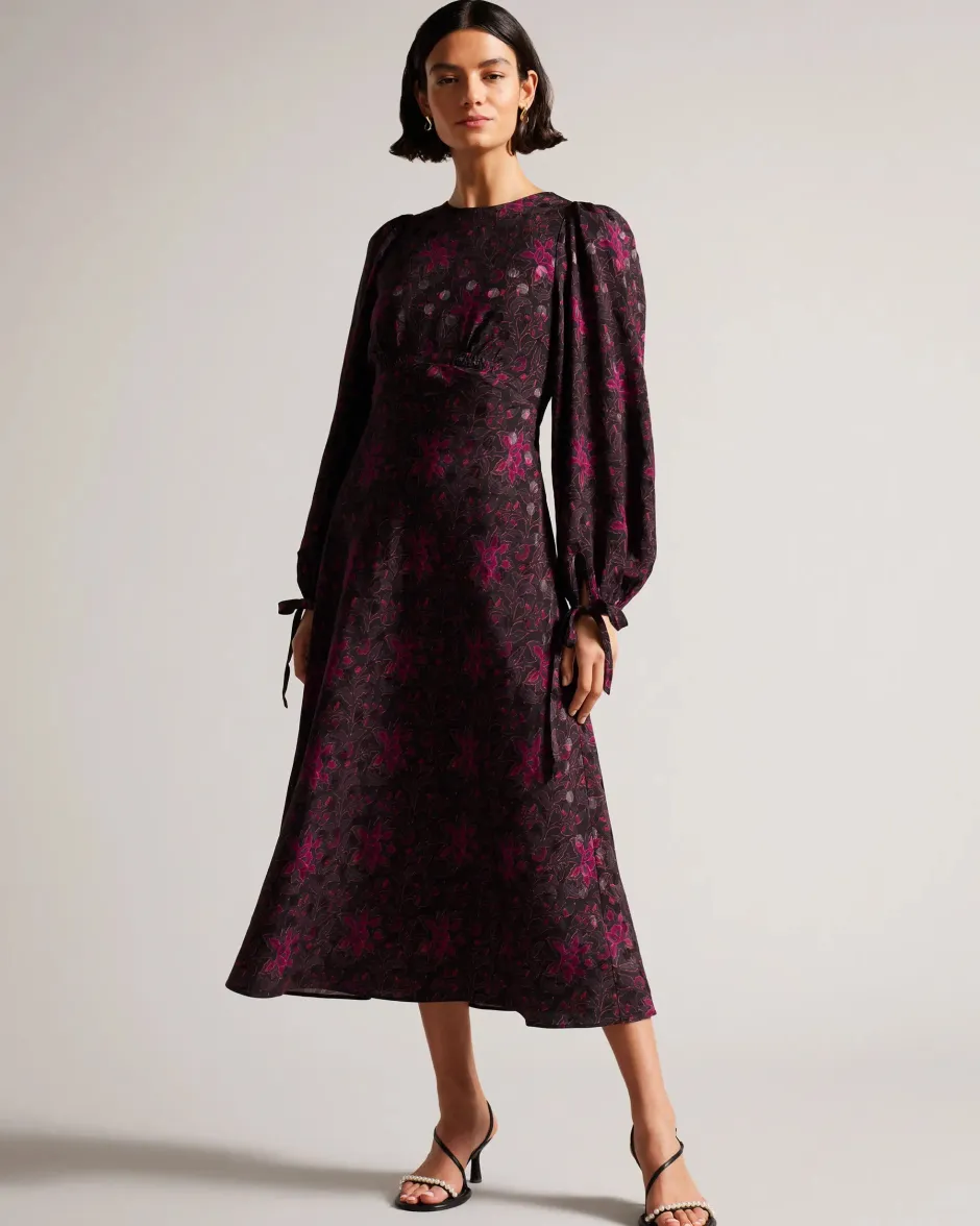 Ted Baker naisten kuosillinen midimekko. – Kukkakuosi – Pitkät tilavat hihat – A-linjainen – Pyöreä kaula – Vetoketju ja nappikiinnitys – Rusetillinen selkä