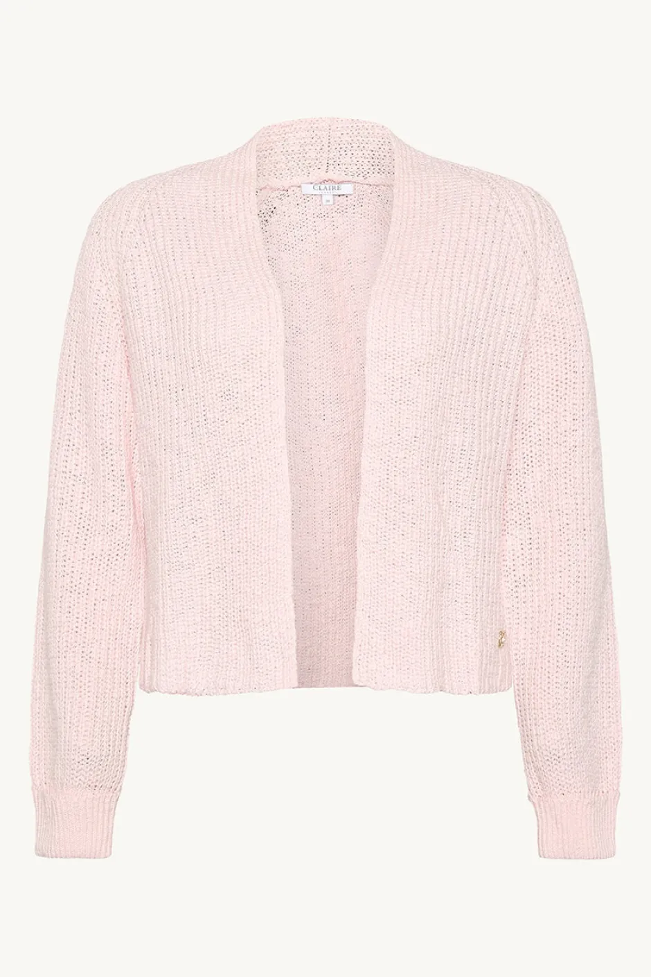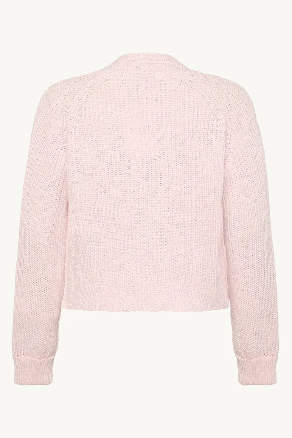 Neuletakki pehmeää puuvillaa, jossa resorireunus ja taitetut hihat.