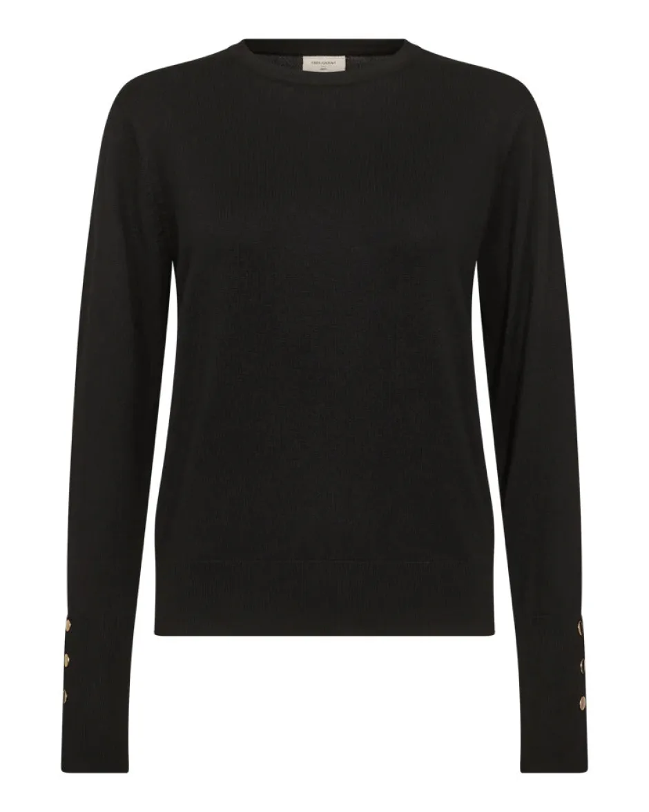 Neulepusero pehmeästä, hienoksi neulotusta materiaalista. Neulepuserossa on yksinkertainen siluetti rennolla istuvuudella, pyöreä kaula-aukko, resorit sekä pitkät hihat koristelluilla napilla..