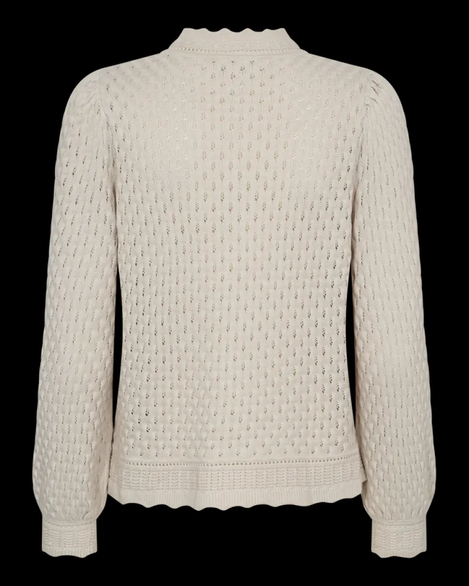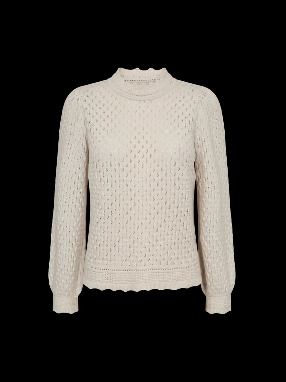 Freequentin kaunis pitsikoristeinen neule pitkillä puhvimaisilla hihoilla. Rento istuvuus.