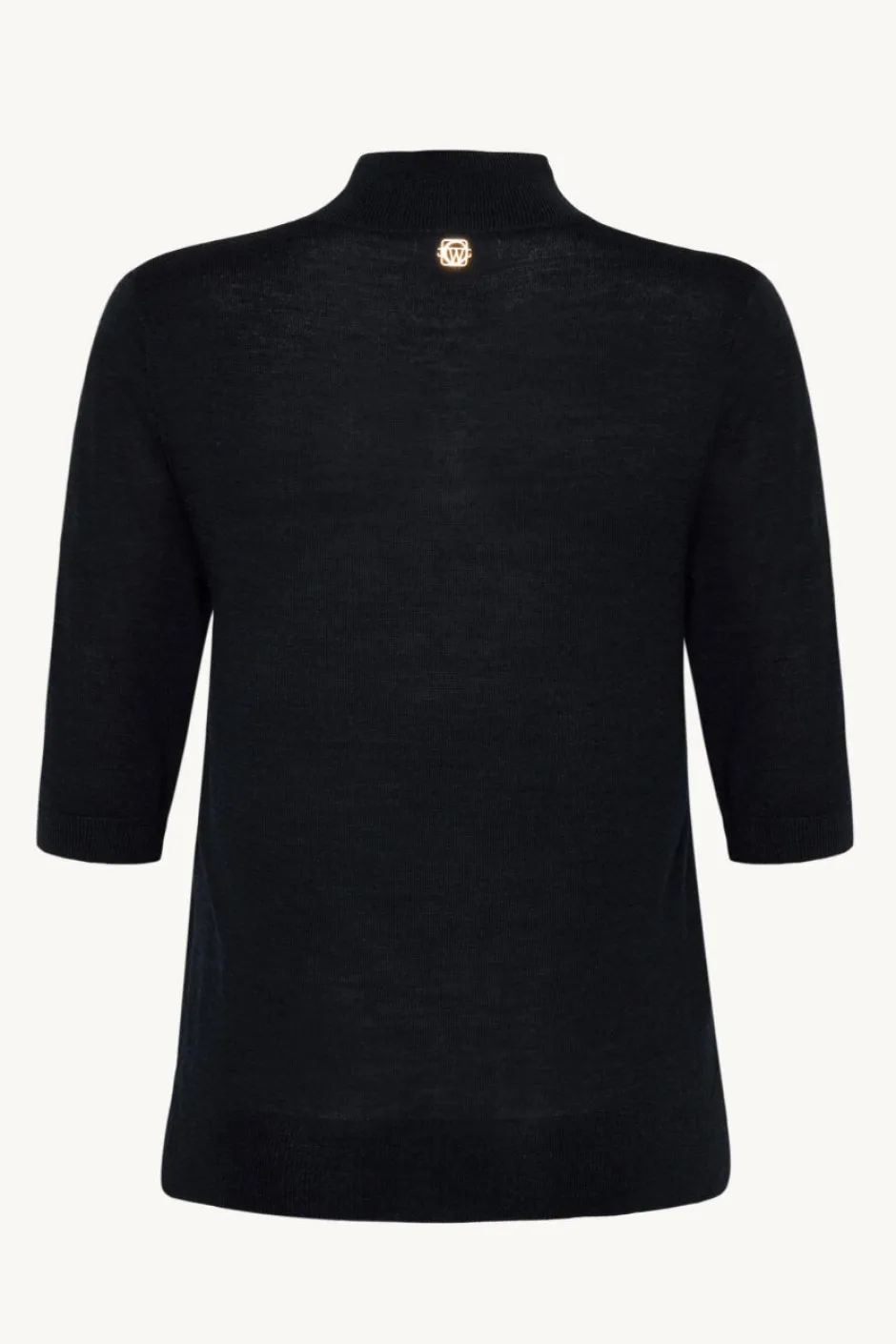 Clairen kaunis ja pehmeä neule lyhyemmillä hihoilla ja pystykauluksella, 100% merinovillaa. Viimeistelty kultaisella merkillä
