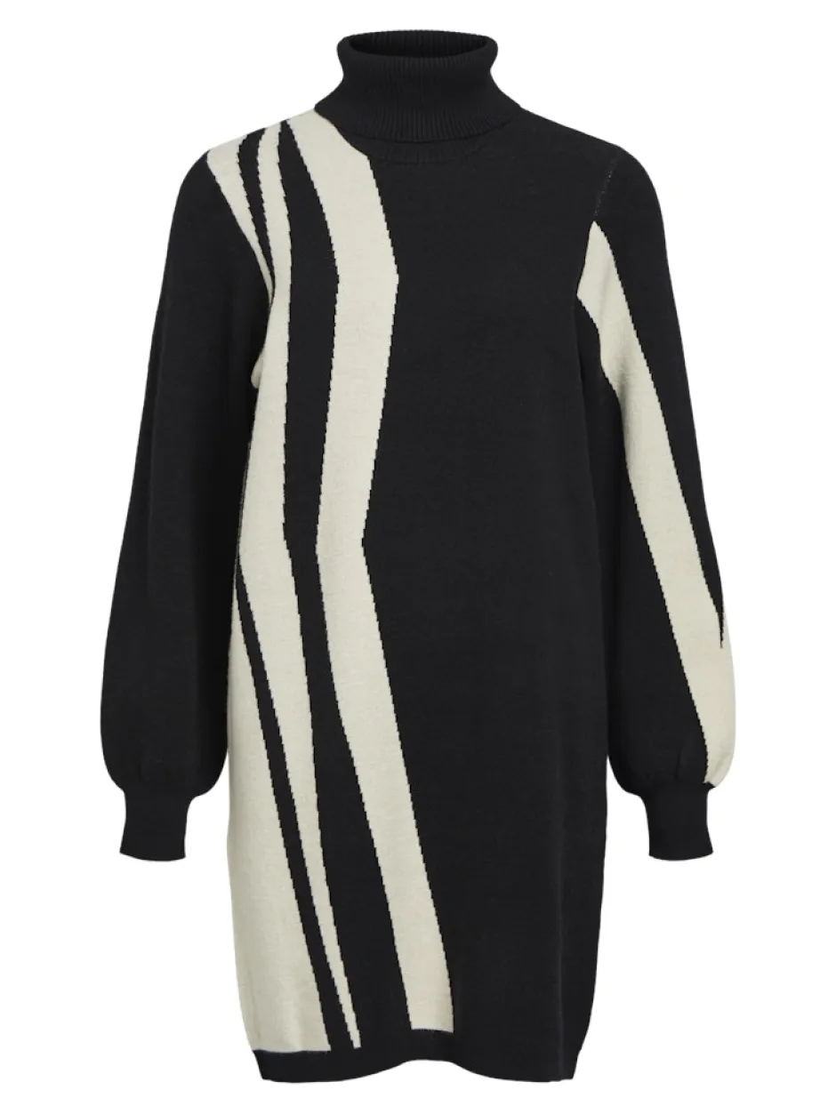 Objectin korkeakauluksinen neulemekko pudotetuilla olkapäillä. Pitkät pallohihat. Loose fit istuvuus.