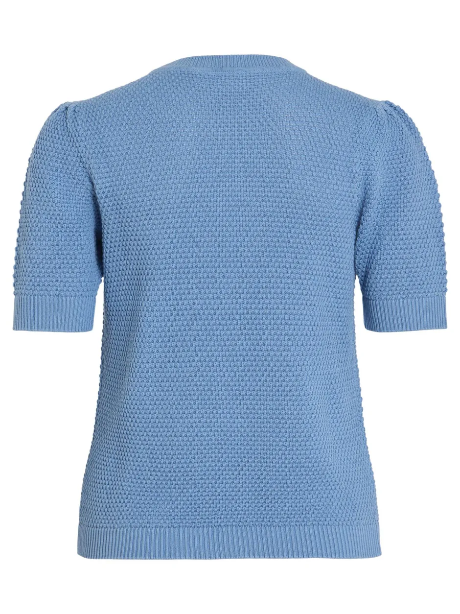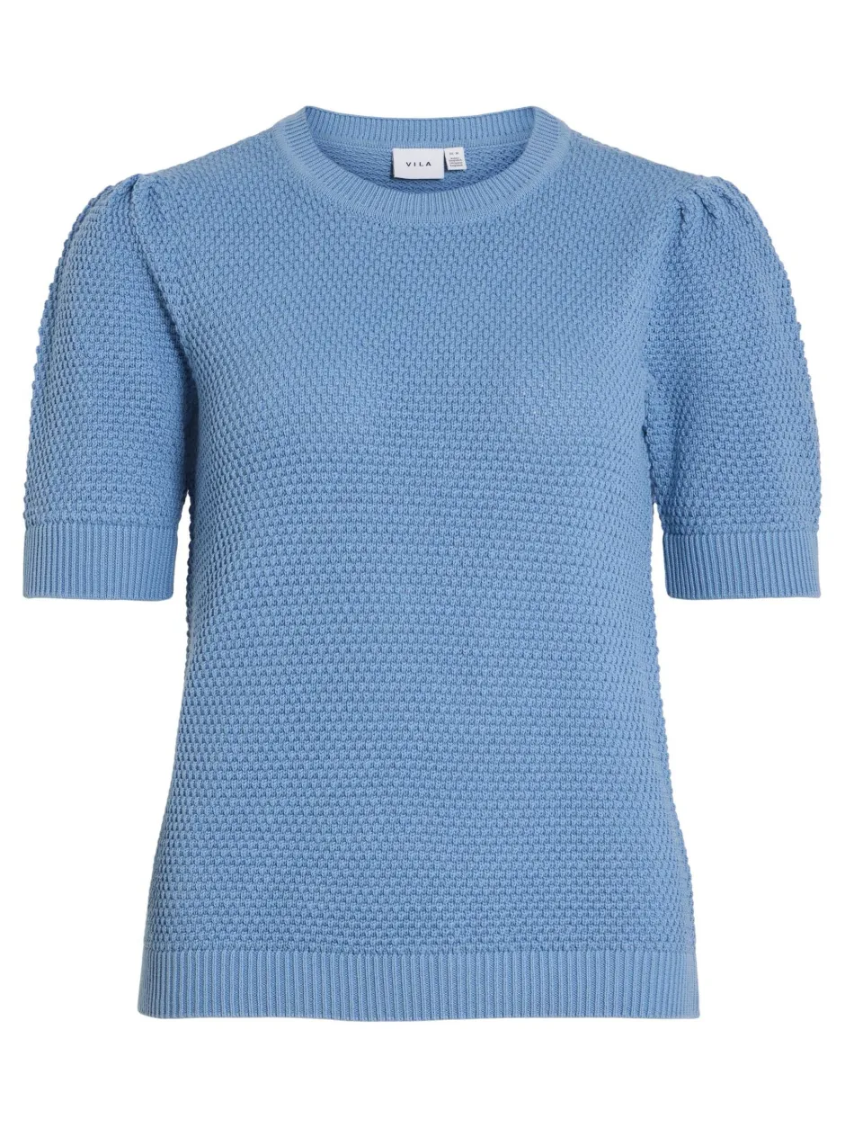 – Lyhythihainen neuletoppi – Resori helmassa – Pyöreä pääntie – Joustavaa neulosta – Pituus: 58 cm koossa M – Hihan pituus: 26 cm koossa M – Malli on 178 cm pitkä, yllä M-koko.