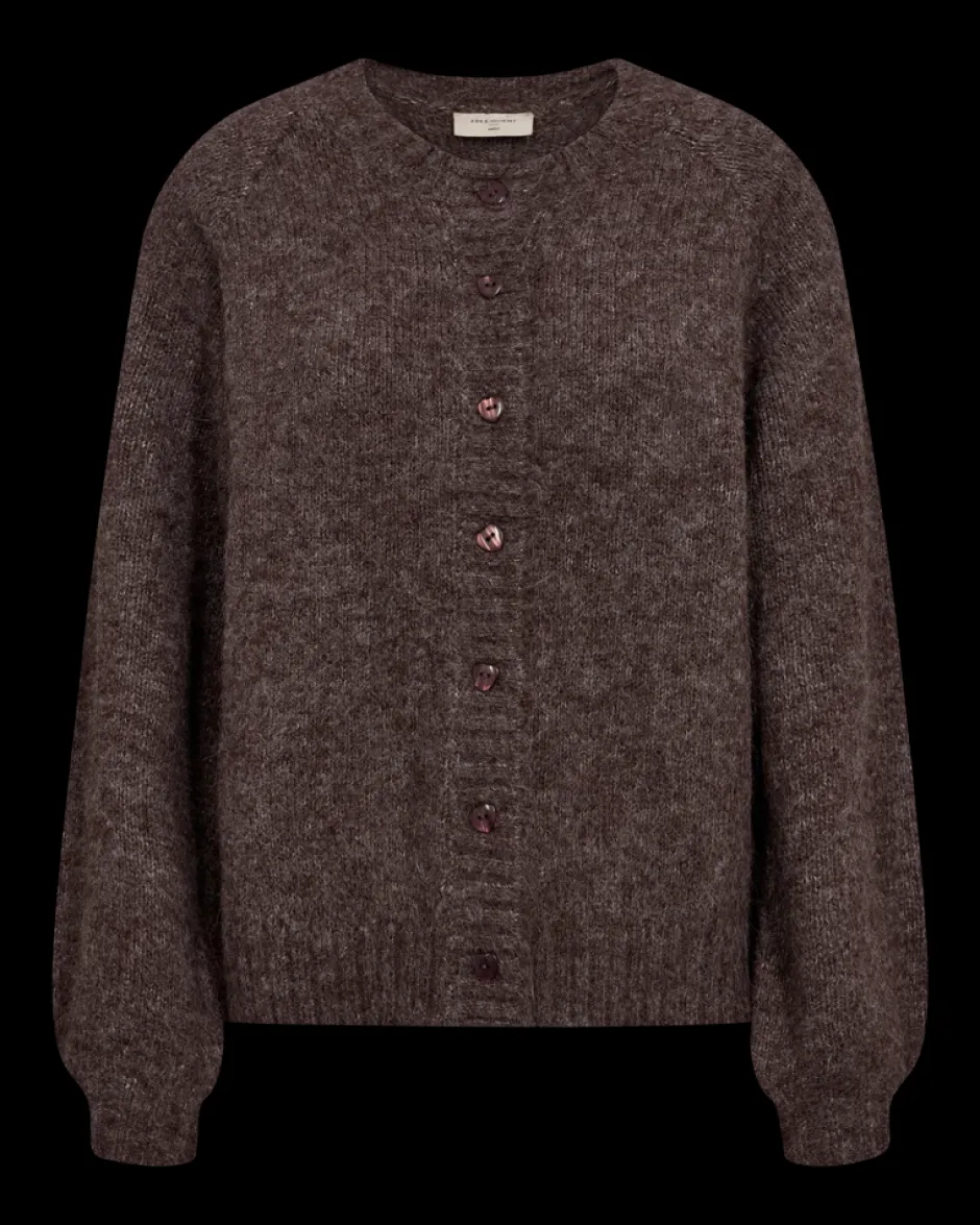 Freequent-neuletakki pehmeästä neulotusta materiaalista. Yksinkertainen neuletakki, jossa on pitkät pallohihat, resori, väljä istuvuus ja sydämenmuotoiset napit edessä.