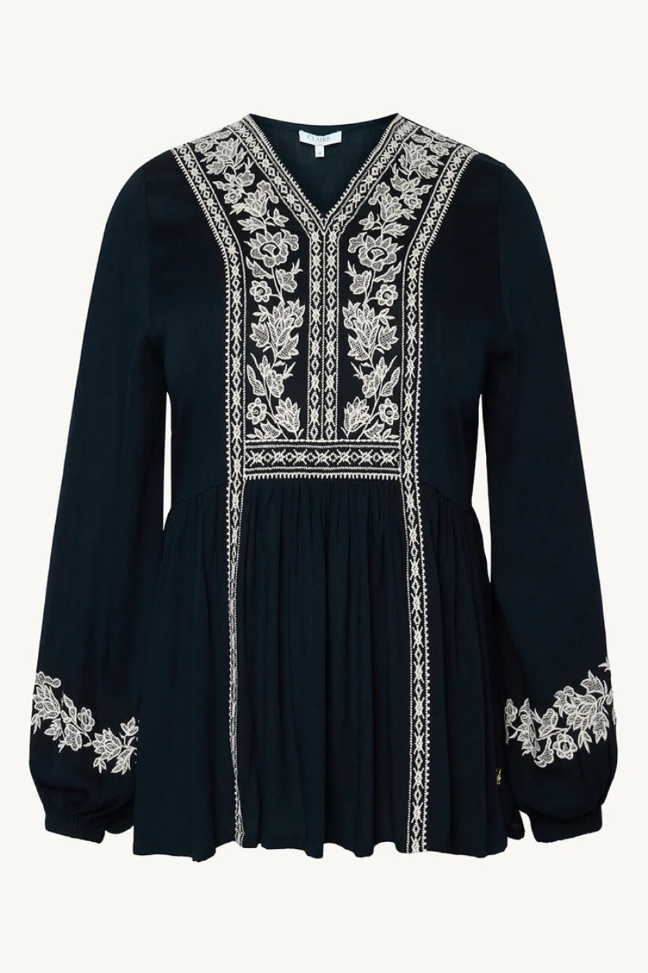 Clairen v-pääntiellä varustettu viskoosipaita, jossa on kirjailtuja yksityiskohtia. Paidassa on puhvimaiset hihat ja joustavat hihansuut.