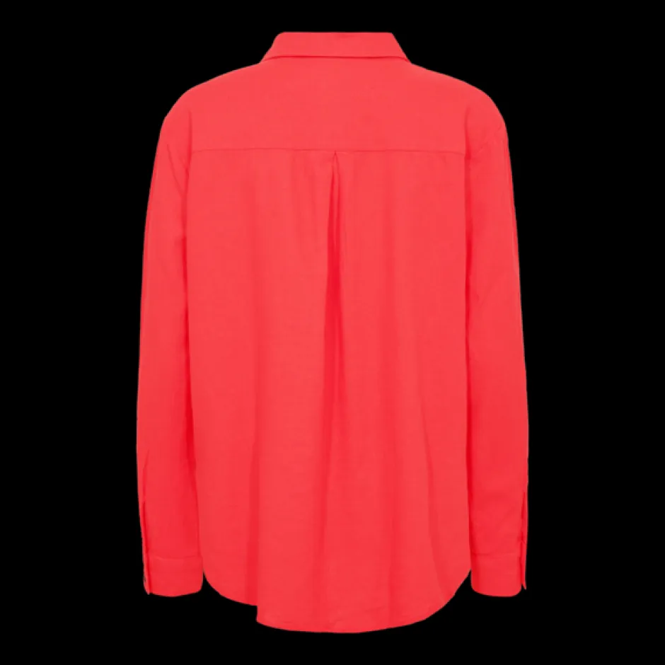 Viileän tuntuinen ja hengittävä pitkähihainen naisten kangaspaita. Paitakaulus, edessä napitus ja hihansuissa napilliset kalvosimet. Yksi rintatasku. Sivuilla helmassa halkiot. Takana kaarrokkeen reunassa vastalaskos väljyysvarana. Kutistuu mahdollisesti 5% pesussa.