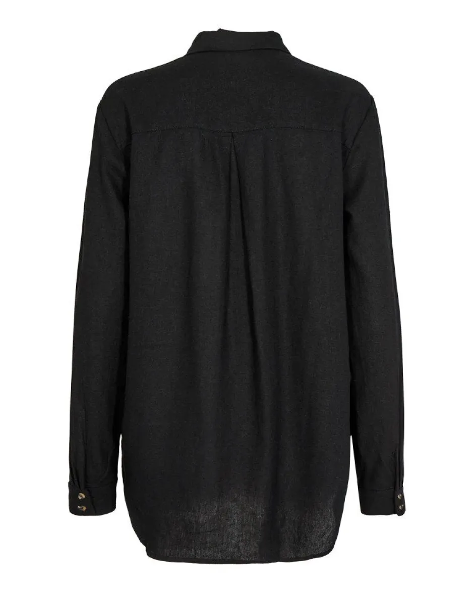 Viileän tuntuinen ja hengittävä pitkähihainen naisten kangaspaita. Paitakaulus, edessä napitus ja hihansuissa napilliset kalvosimet. Yksi rintatasku. Sivuilla helmassa halkiot. Takana kaarrokkeen reunassa vastalaskos väljyysvarana. Kutistuu mahdollisesti 5% pesussa.