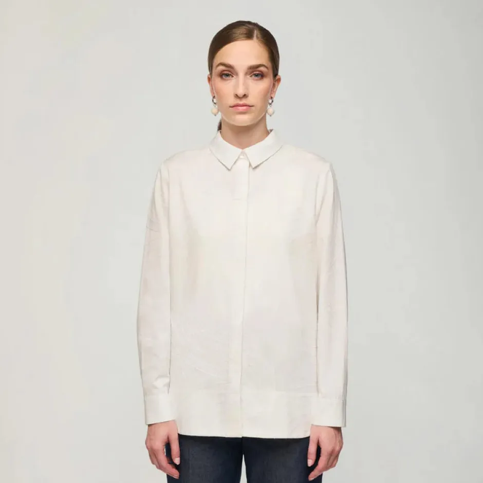 Leila-kauluspaidassa on väljän rento malli, piilonapitus edessä, pitkät hihat ja kauniisti pyöristetty helma. Paitaan on brodeerattu valkoisella Aarikan pyöreitä muotoja toistava kuvio. Leila-paita on luottovaate, joka sopii yhdisteltäväksi moneen alaosaan.