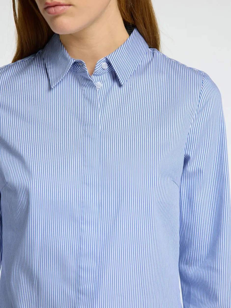 Tämä klassinen raidallinen kauluspaita on työpukeutumisen kulmakivi. Se on istuva ja kapenee hieman vyötäröltä. Paita sopii käytettäväksi niin housujen, hameen kuin kaksiosaisen puvunkin kanssa.