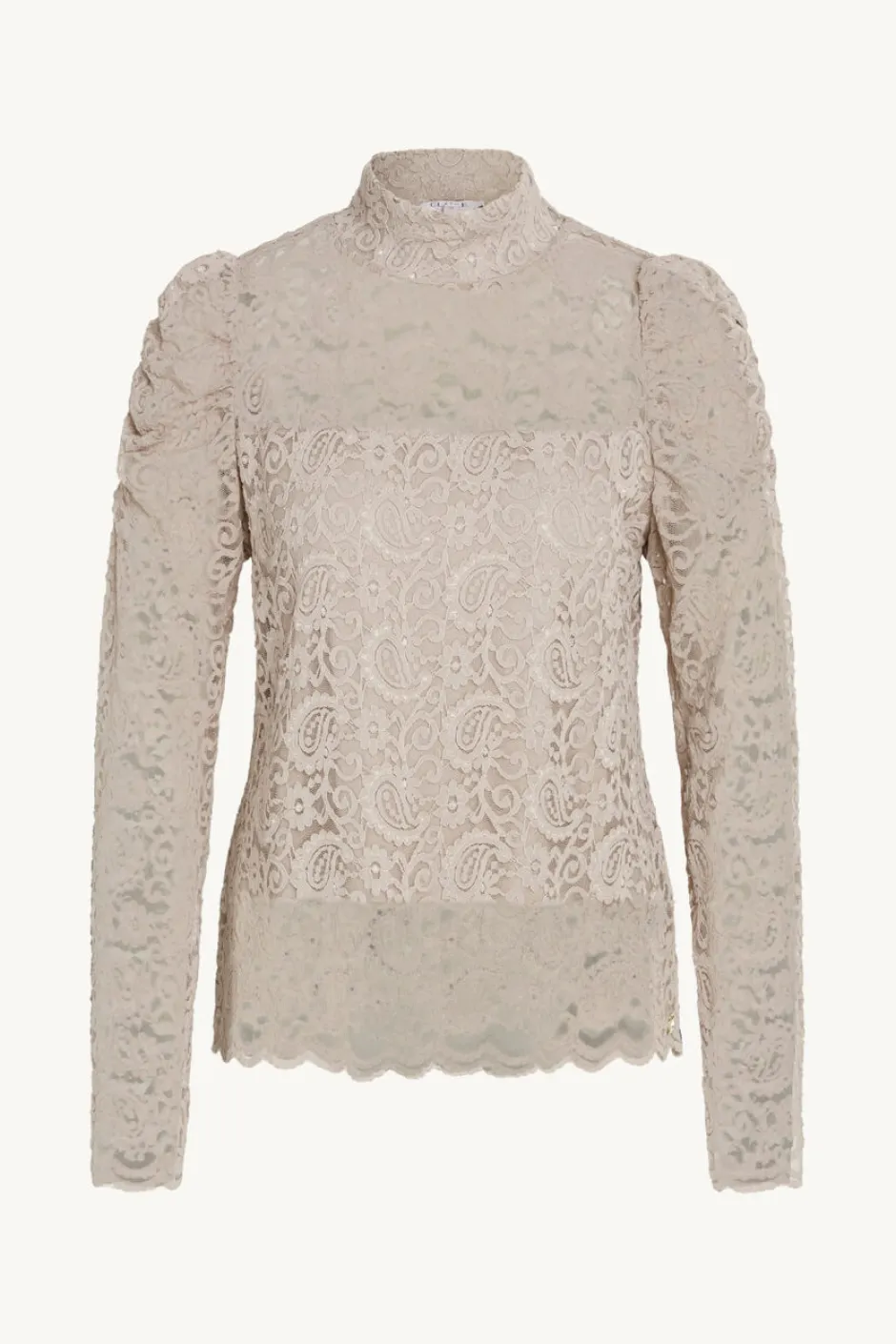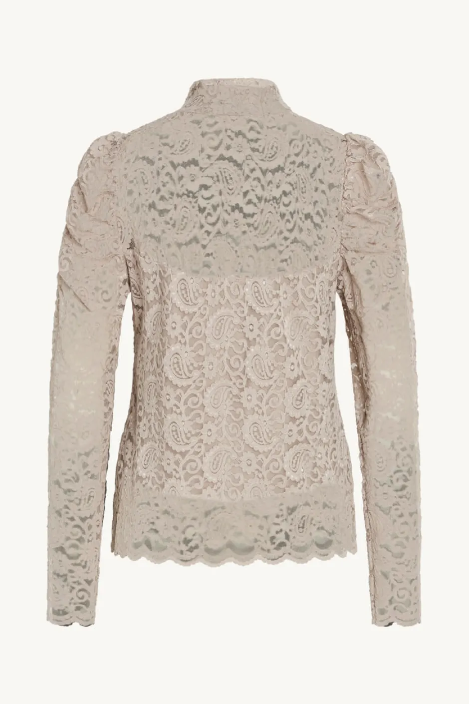 Clairen pitkähihainen pitsipaita korkealla kauluksella. Paidassa on poimutuksia hartioilla ja joustavaa rypytystä hihoissa. Pehmeä ja sileä vuori.