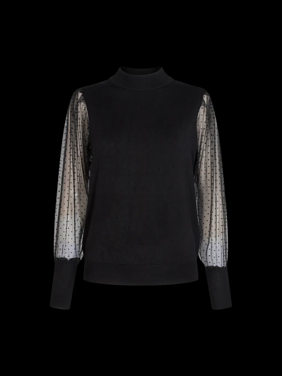 Naisten juhlava neule pehmeää viskoosia. Sifonkihihat on pussimaiset läpikuultavat ja niissä on pilkkukuvio. Kaulus on kevyesti puolikorkea.