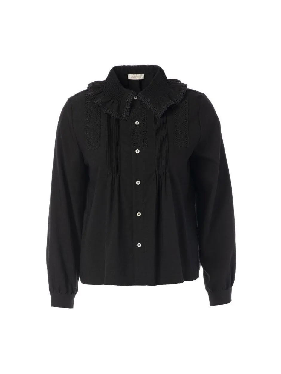 JcSophie ”Joan” Blouse Black hurmaa naisellisen ja ajattoman siluetin yhdistelmässä: rento oversized-leikkaus ja ylelliset romanttiset yksityiskohdat, kuten brodeerattu boordikaulus ja herkkä pitsisomistus yläosassa. Materiaalina viskoosi–polyesteriyhdistelmä (46/40 % ) tarjoaa pehmeyttä ja laskeutumista, ja pusero istuu mukavasti ilman kiristävyyttä