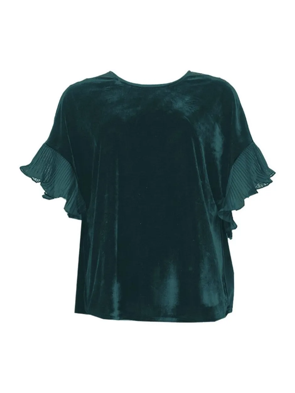 Naisten juhlava velourpusero, jossa lyhyet pliseeratut sifonkihihat. Puserossa O-pääntie. Suora väljästi laskeutuva malli.