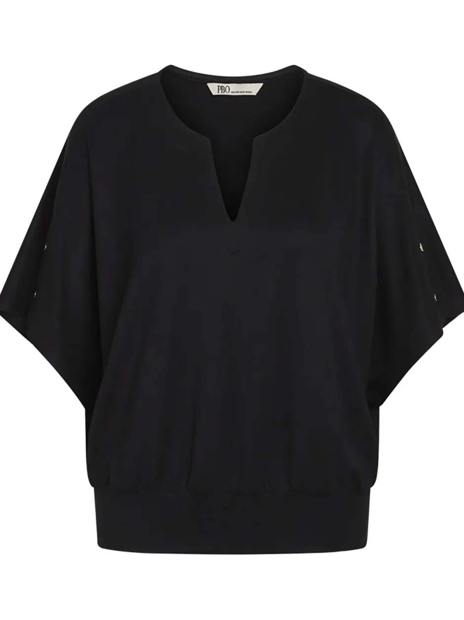 Tässä väljässä puserossa on imarteleva V-pääntie ja lyhyet hihat, joissa on halkiot, joita koristaa kaksi kullanväristä nepparia. Tämä musta pusero huokuu ajatonta eleganssia ja sopii sekä muodollisiin tilaisuuksiin että arkipäiviin.