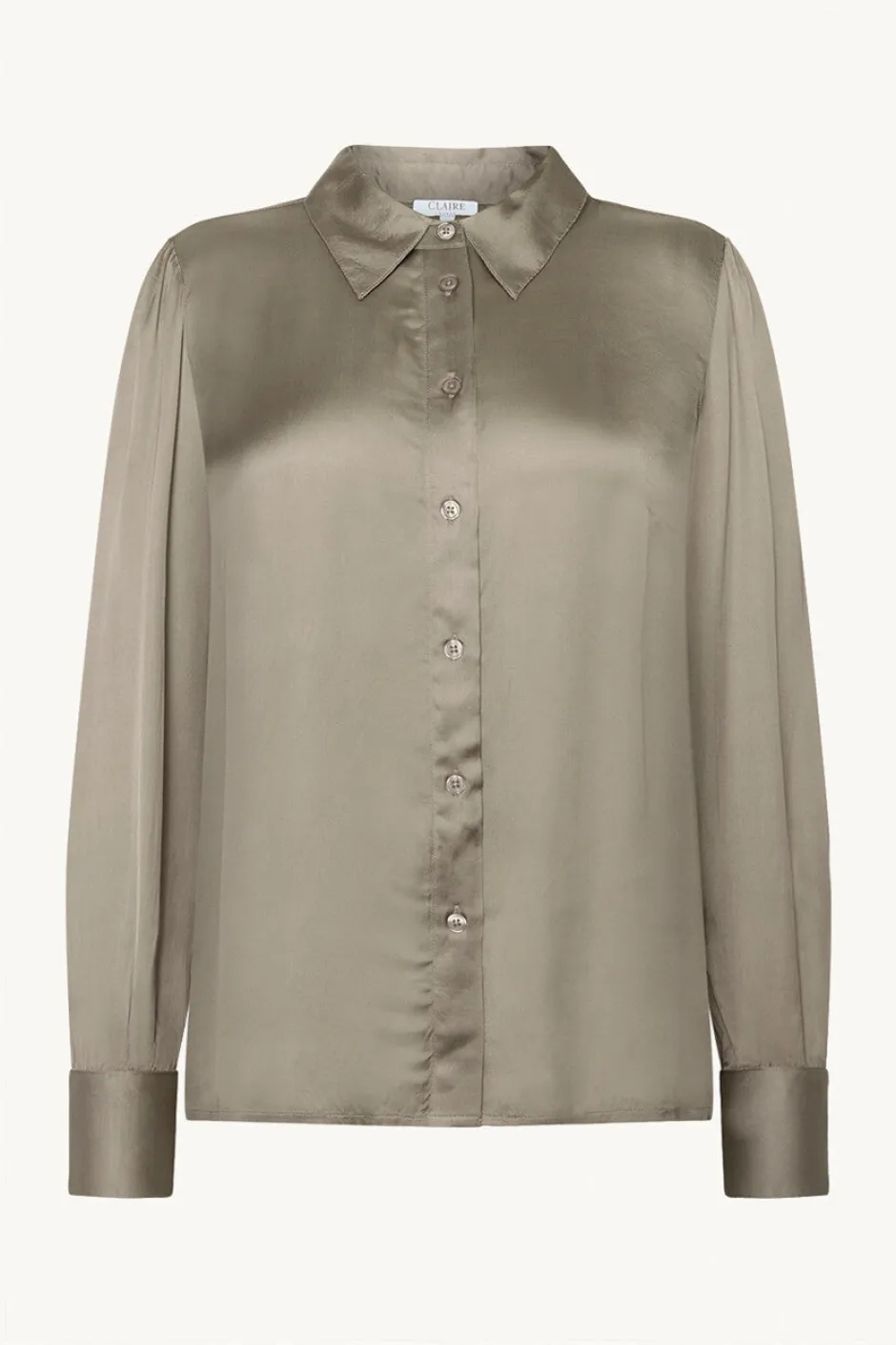Clairen pusero pehmeästä viskoosista. Puserossa on klassinen kaulus, laskokset olkapäillä, nappikiinnitys sekä napit hihoissa.
