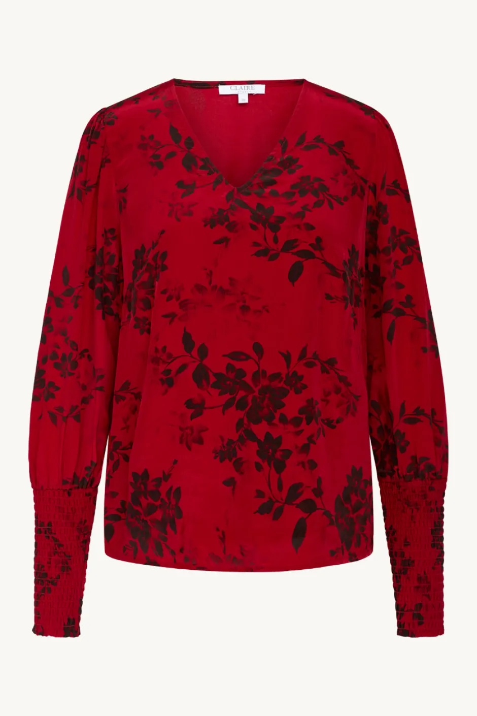 Naisten viskoosipusero V-pääntiellä ja hihoissa on leveät smokkirypytykset. Punaisessa kankaassa on hillitty musta kukkakuviointi. Suora helma.