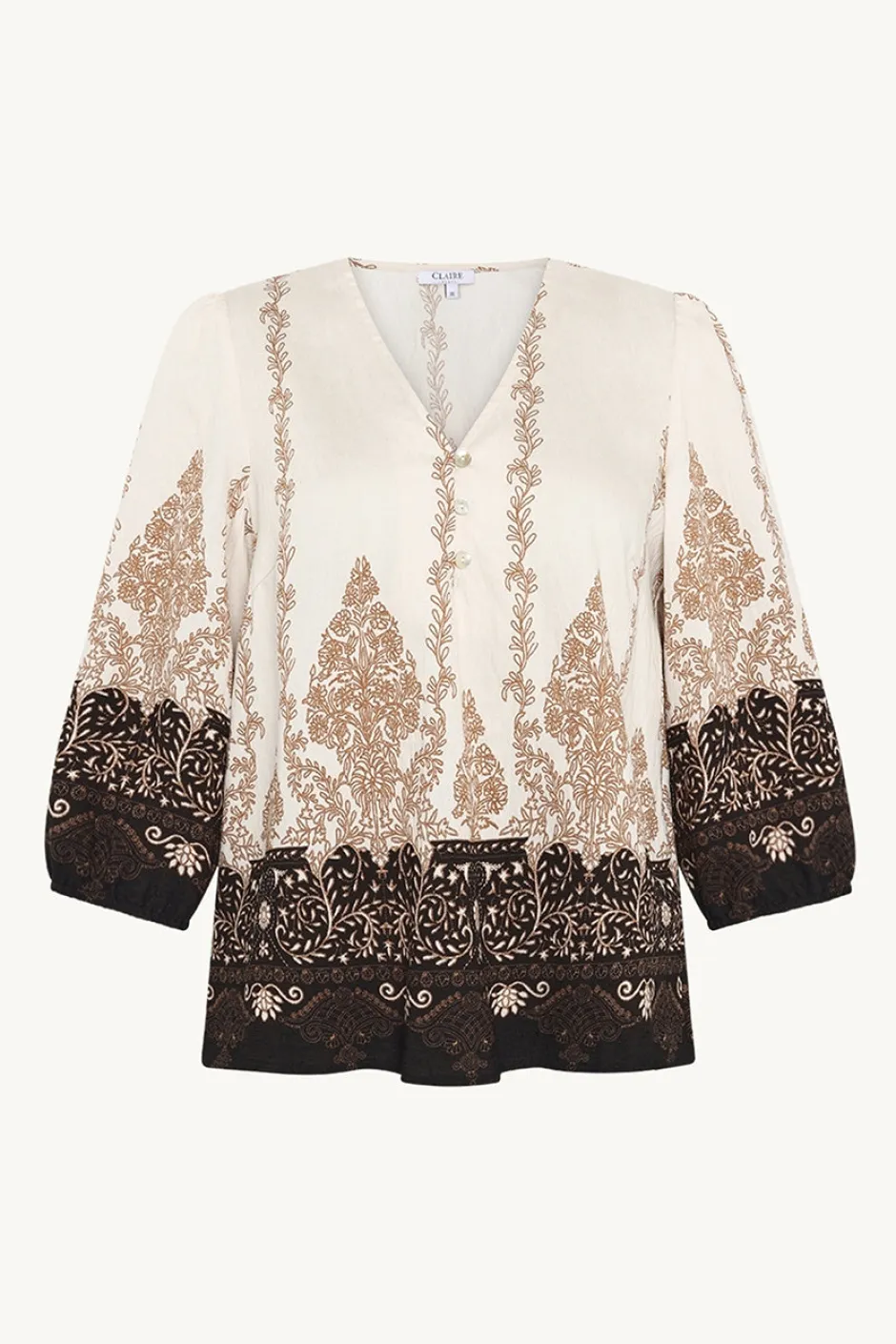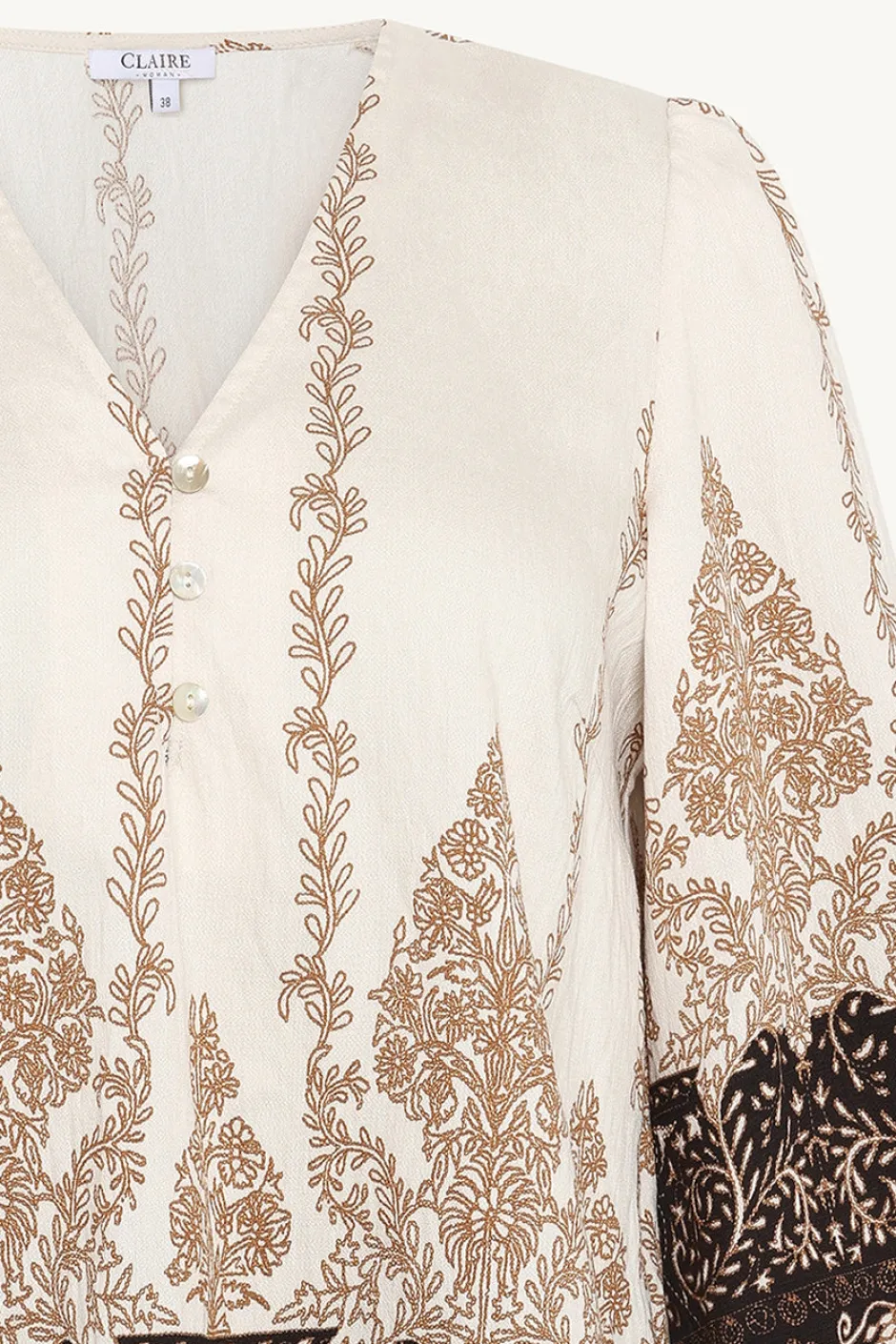 Claire Womanin 50-vuotisjuhlamalliston Rosine-pusero tuo vaatekaappiisi ripauksen juhlan tuntua ja ajatonta eleganssia. Tämä kevyestä viskoosisekoitteesta valmistettu pusero hurmaa hienostuneella Gardenia-printillään ja huolitelluilla yksityiskohdillaan