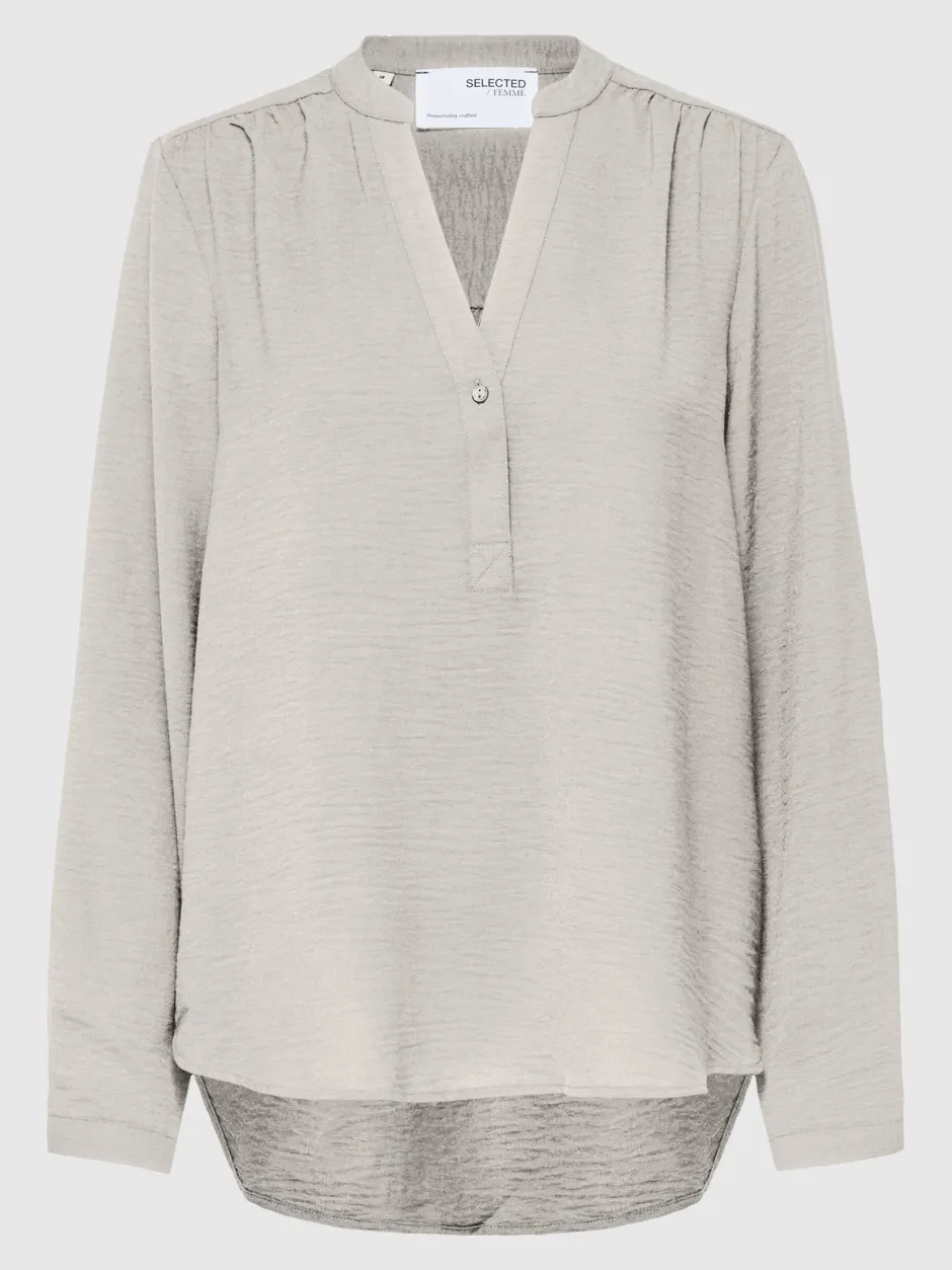 Monipuolinen pusero jokaisen vaatekaappiin. – V-kaula-aukko nauhakauluksella – Yksirivinen napitus – Pitkät napitettavat hihat – Väljä istuvuus