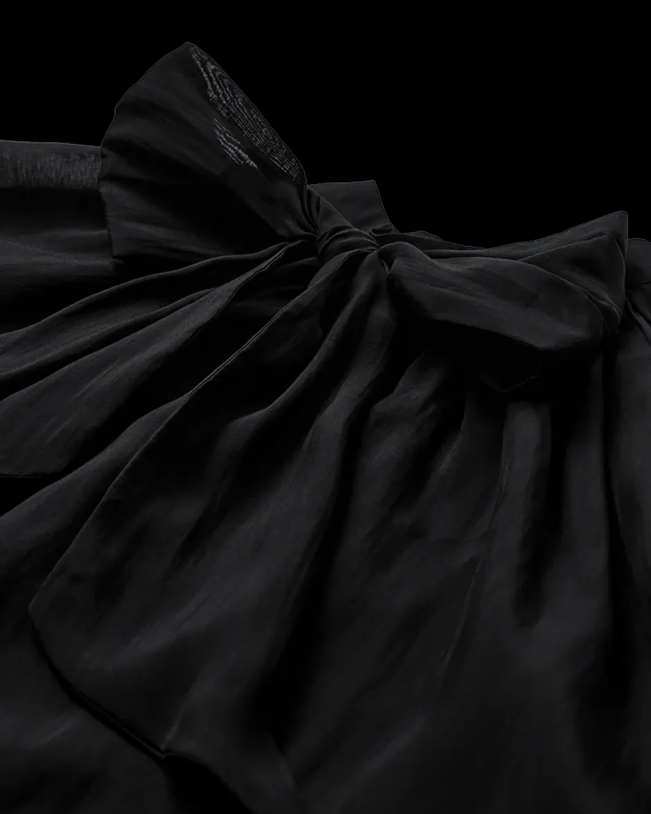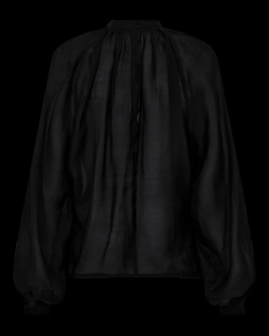 CMTILLY-BLOUSE on eksklusiivinen pusero, jossa on ylellinen, irrotettava rusettikoriste korkeassa kauluksessa, laskostetut yksityiskohdat, kangasnapeilla koristeltu halkio takana ja pitkät raglanhihat, joissa on runsas ilmapalloefekti ja nappikiinnitys.