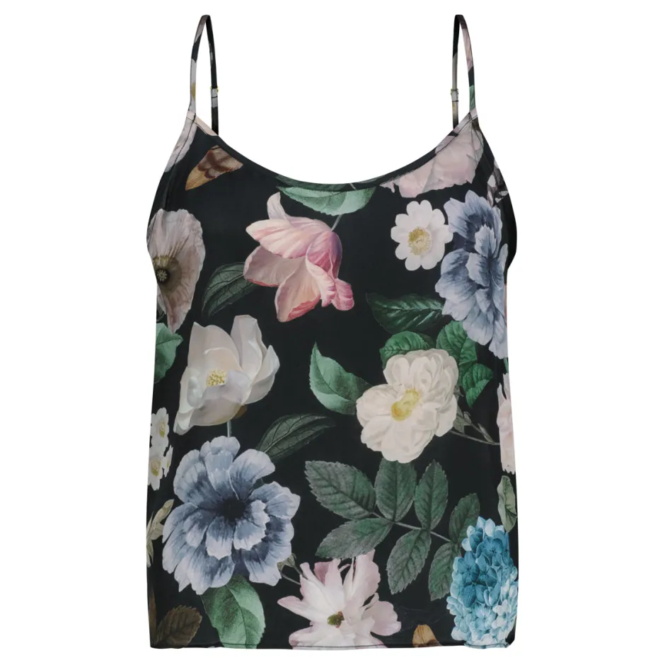 Klementin upea naisten pyjama tuo ylellisyyttä arjen aamuihin ja ihaniin iltahetkiin. Kaksiosaiseen yöasuun kuuluvat naruolkaiminen toppi sekä leveälahkeiset housut, joissa joustava kuminauha sekä kiristettävä nauha vyötäröllä. Pyjamassa on rennon väljä istuvuus ja tyylin viimeistelee näyttävä kukkakuosi.