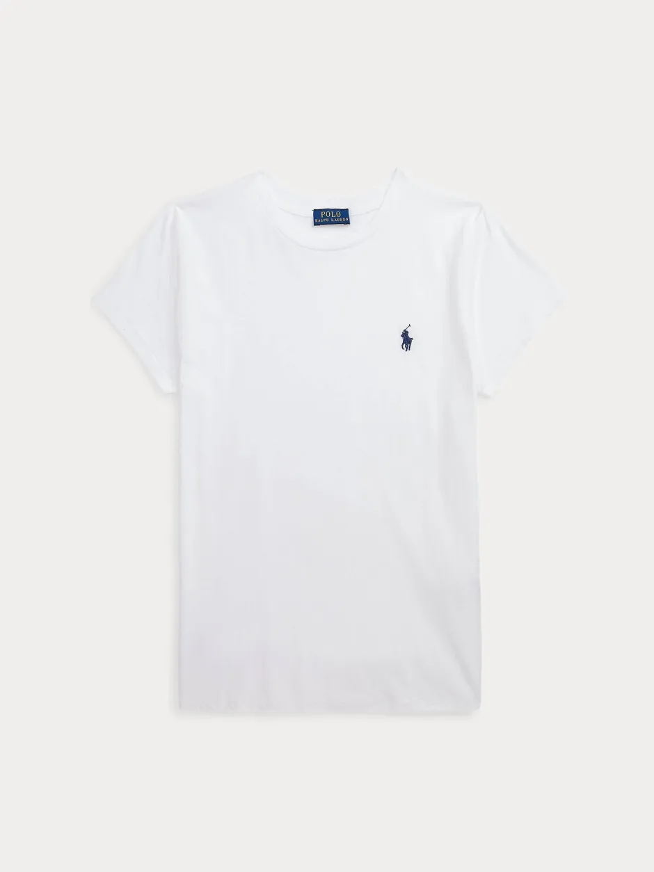 Suoraan leikattu puuvillajersey-paidaton pyöreä pääntie on pesty pehmeyden lisäämiseksi ja viimeistelty tavaramerkiksi muodostuneella poni-brodeerauksellamme.