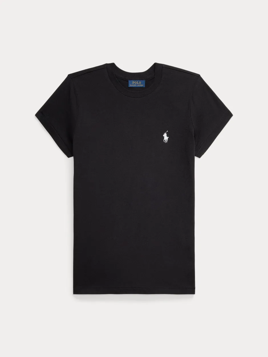 Suoraan leikattu puuvillajersey-paidaton pyöreä pääntie on pesty pehmeyden lisäämiseksi ja viimeistelty tavaramerkiksi muodostuneella poni-brodeerauksellamme.