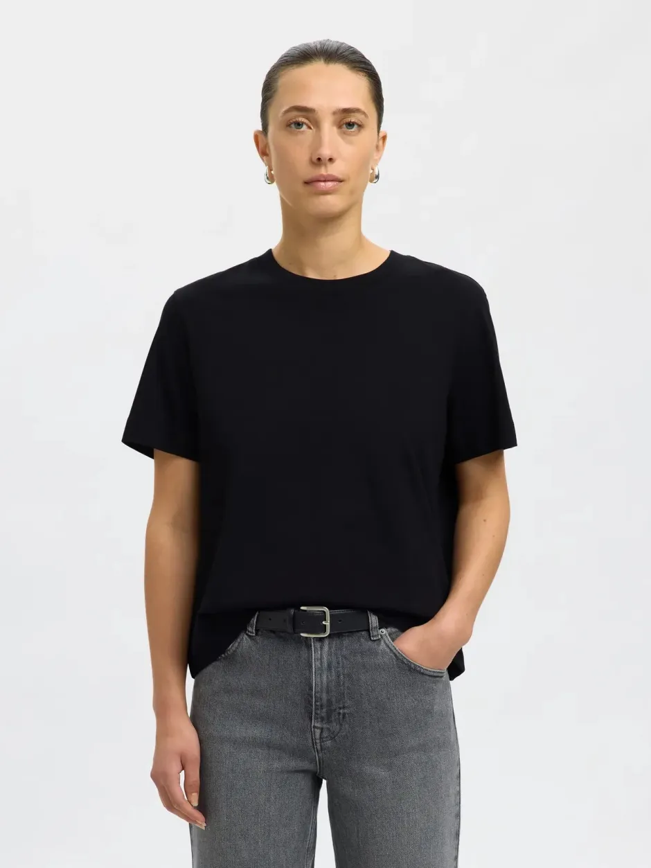 Laatikkomaiseen istuvuuteen leikattu naisten simppeli t-paita. Valmistettu hyvin hengittävästä ja pehmeästä puuvillasta. Sopii hyvin yhteen melkein minkä tahansa kanssa, mutta suosittelemme tyylikkäämpää ilmettä yhdistämällä se tummansinisiin farkkuihin, lenkkareihin ja bleiseriin. – Ribattu pyöreä kaula-aukko – Alaslasketut olkapäät – Lyhyet hihat – Laatikkomainen istuvuus